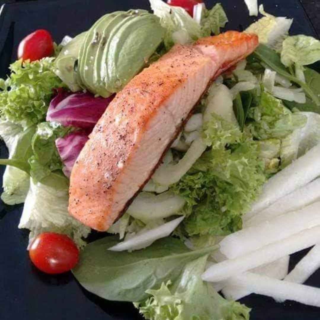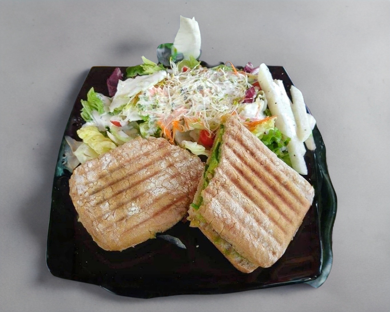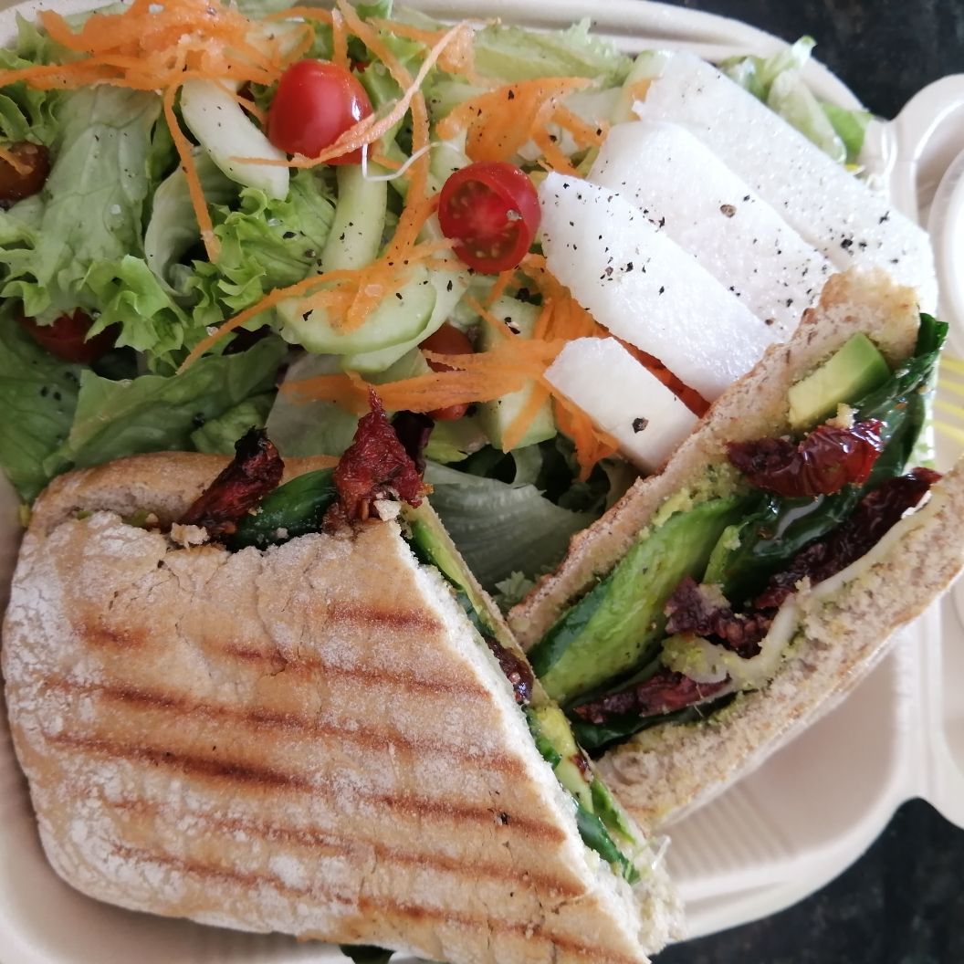 Panini con aderezo de chipotle, espinacas, queso gouda, aguacate y tocino. Acompañado de ensalada italiana, jícama, tomate cherry, pepino, zanahoria rallada y germen. Aderezo artesanal de albahaca para la ensalada.