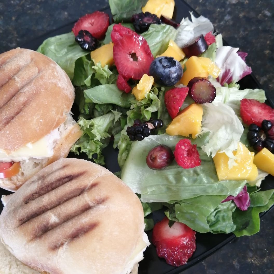 Dos mini bollos con mayonesa, queso gouda, pollo o pavo y tomate cherry con ensalada de frutos del bosque (lechuga, mango, uvas, zarzamora, frambuesa y fresas).