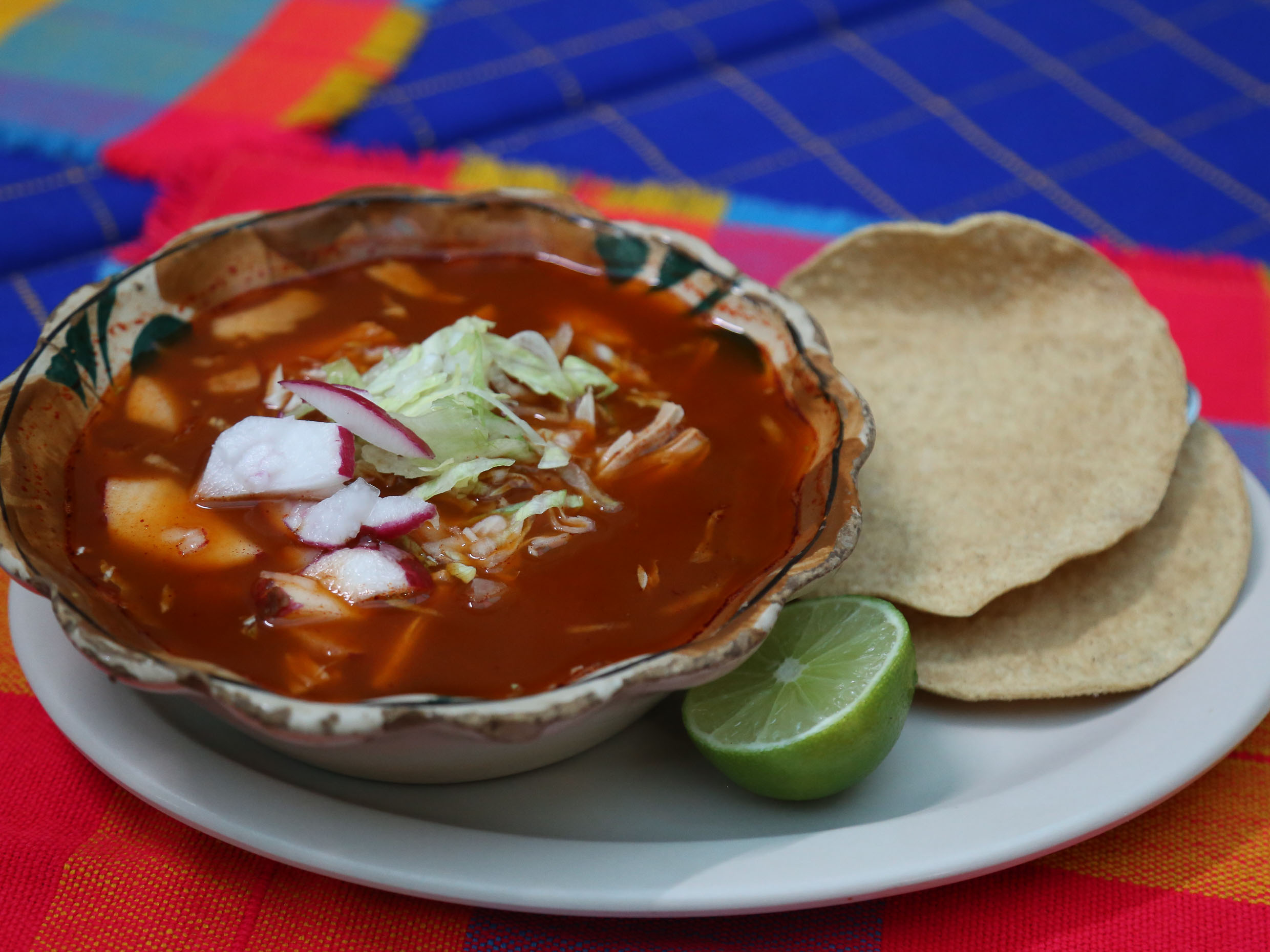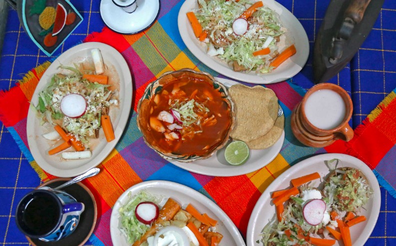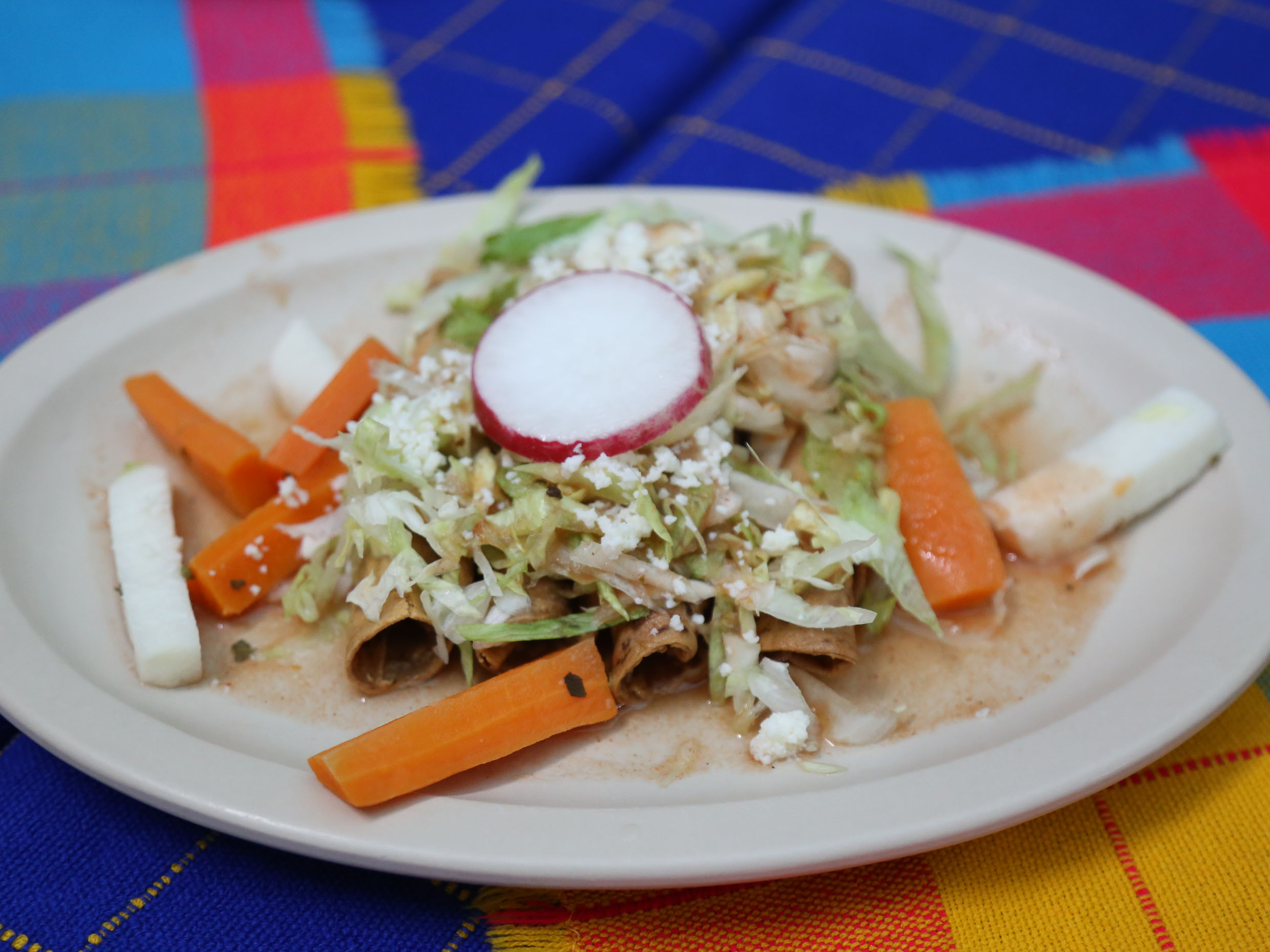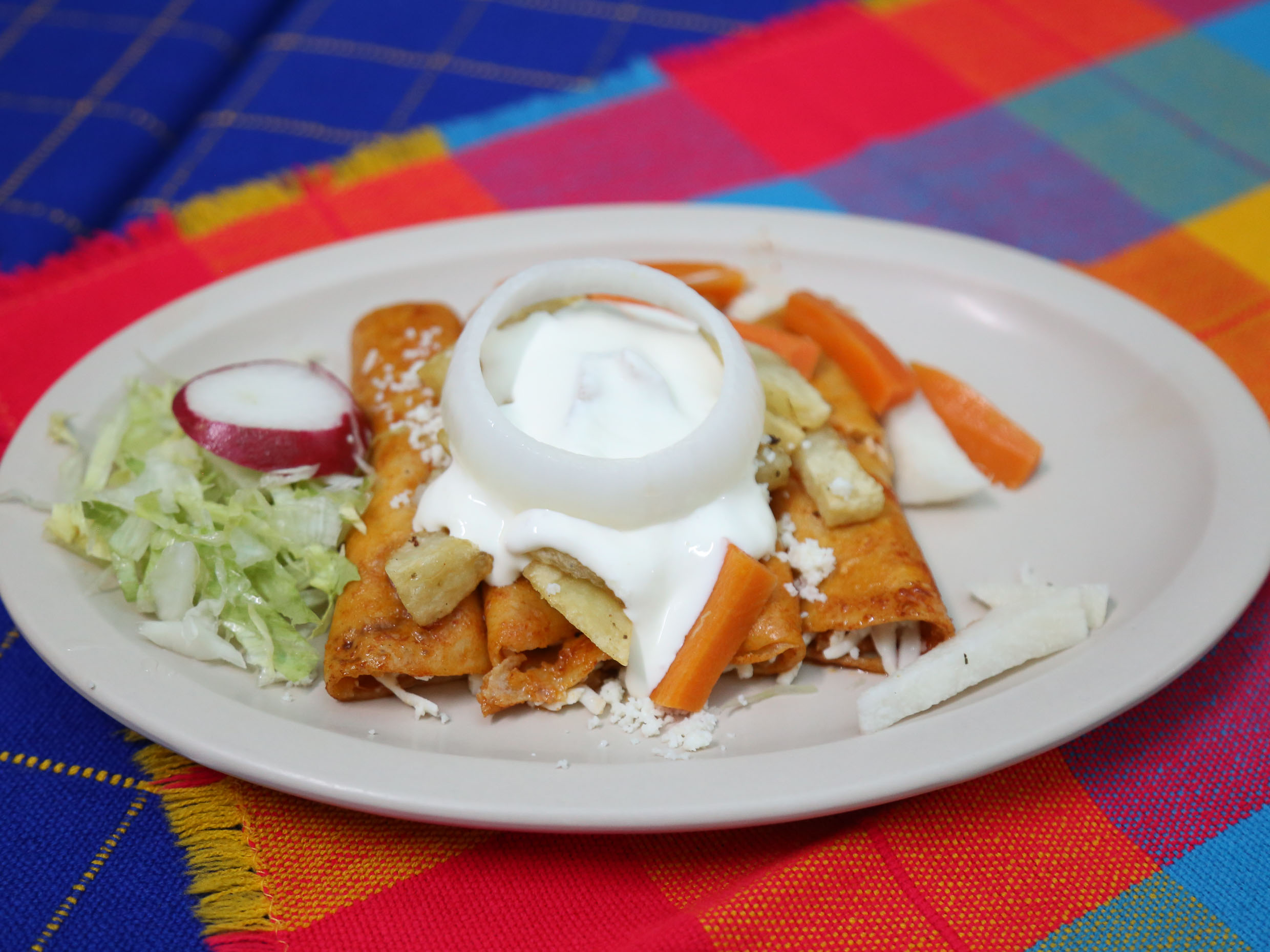 Con 2 tacos, 2 flautas, 2 enchiladas, 1 sope, verdura curtida, cueritos delgados, crema y guacamole.