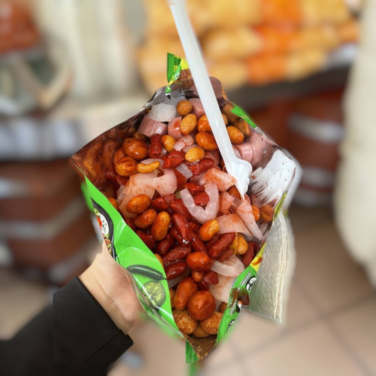 Con jicama, pepino, cueritos, Zanahoria rayada, cacahuate Japones, Sal y Limon y Salsa Valentina.