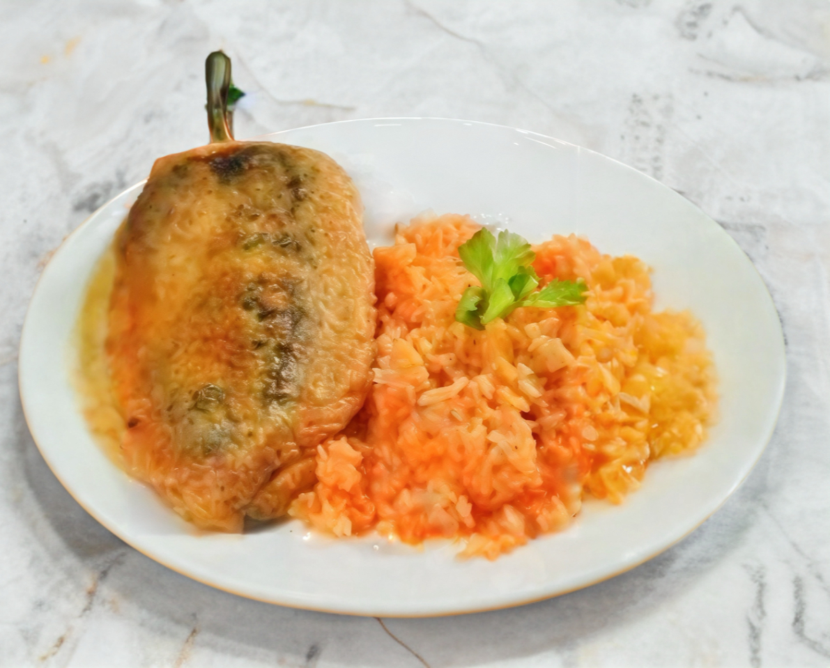 Chile Relleno de Queso, Acompañado de Arroz y Salsa Roja