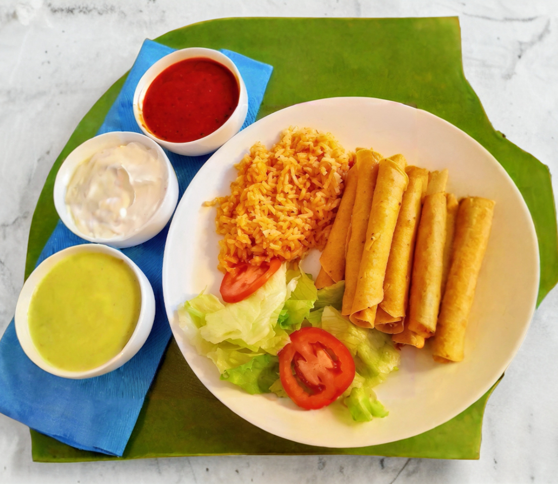 Orden de 5 Flautas incluye Arroz, Lechuga, Crema y Salsa Roja (porcion personal)