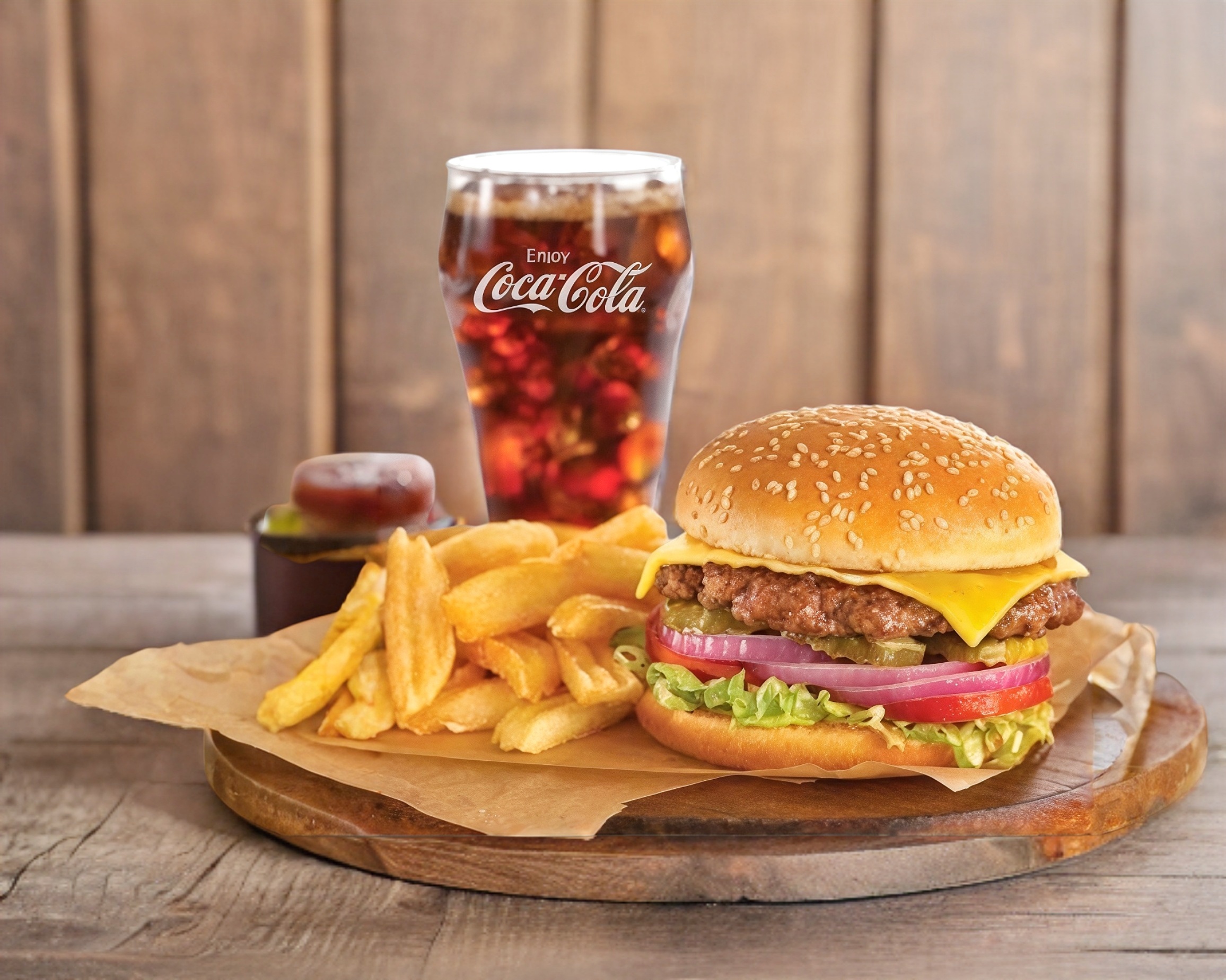 hamburguesa sencilla con pan tradicional, carne de Res 100 %, papas francesa (Aprox. 120 gr ) y refresco Coca-Cola botella 400ml.