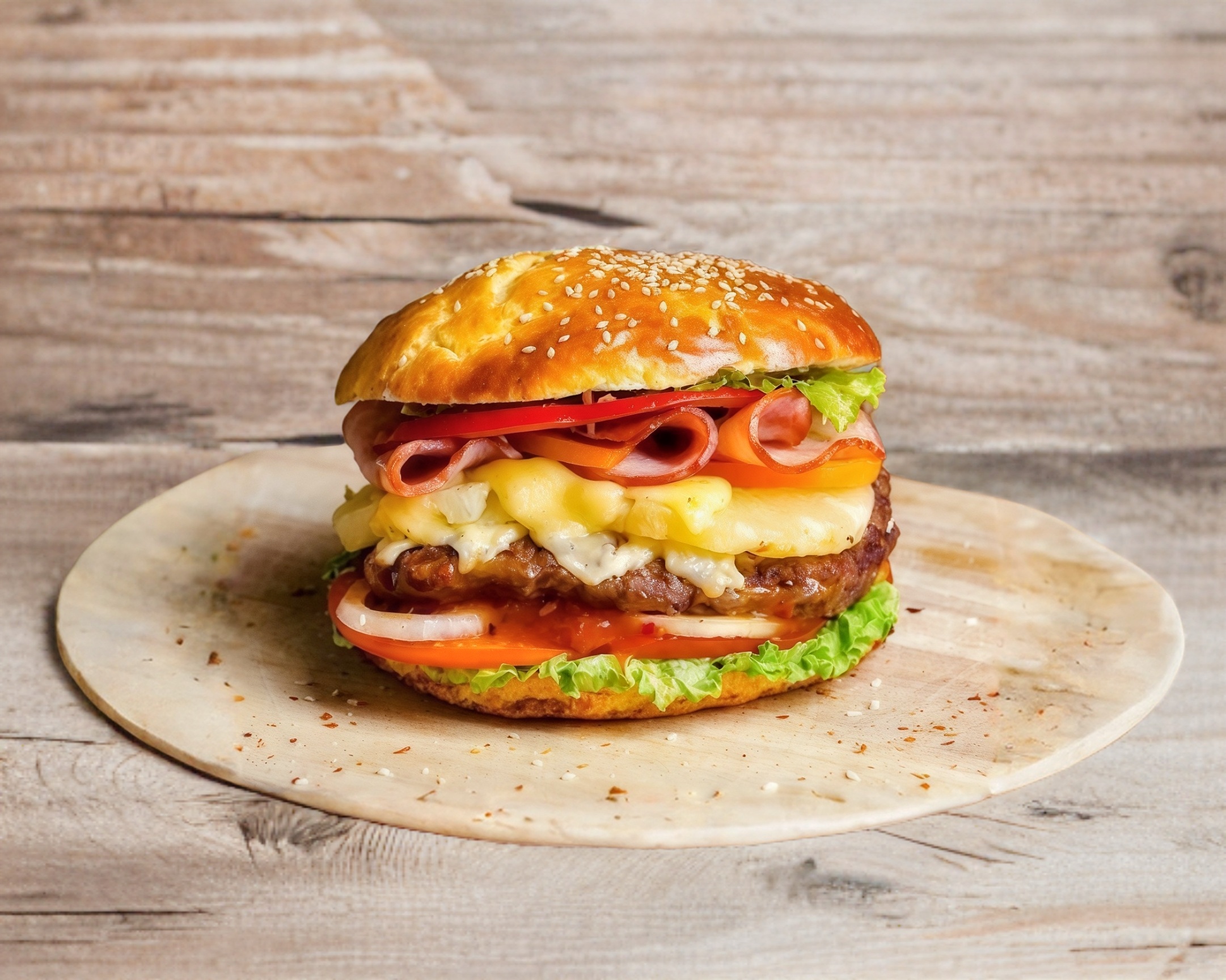 jamon. piña, carne, verduras, aderezo y queso amarillo