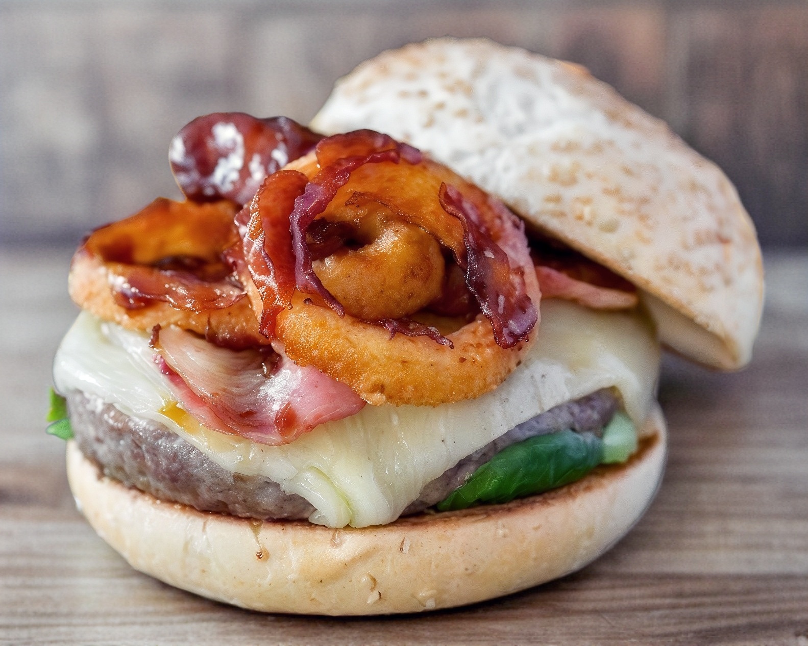 Res, aros de cebolla, BBQ, lechuga, jitomate, cebolla, aguacate y queso amarillo.