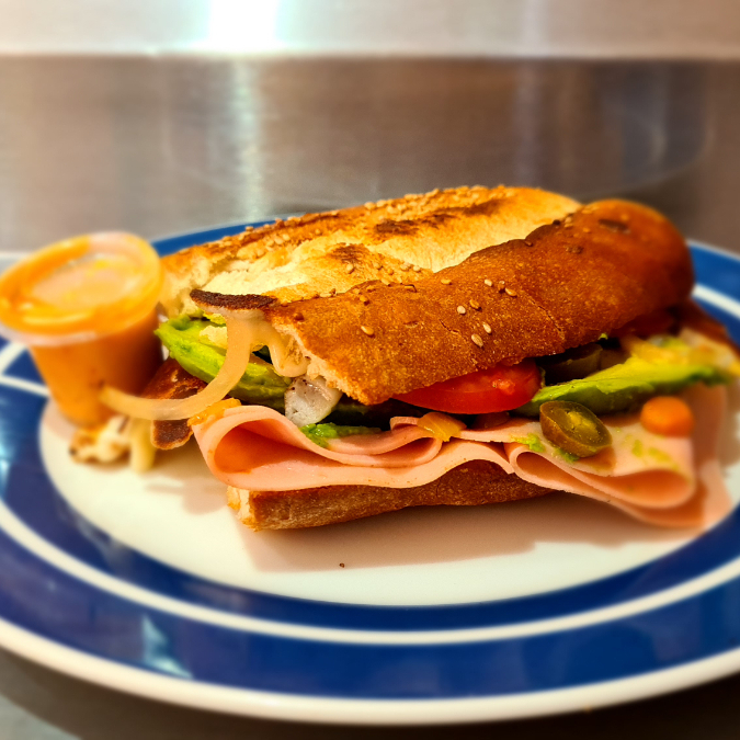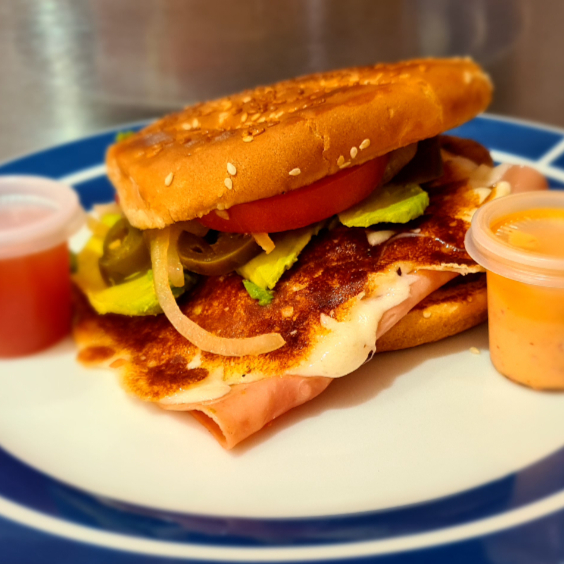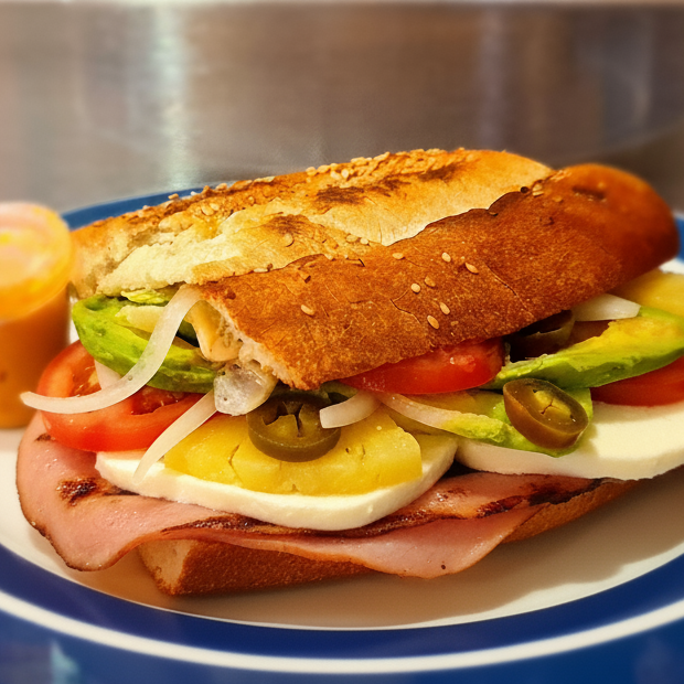 Deliciosa torta de jamón calentada a la plancha con queso fundido, jitomate, aguacate, cebolla, chiles en vinagre y su porción de chimichurri.