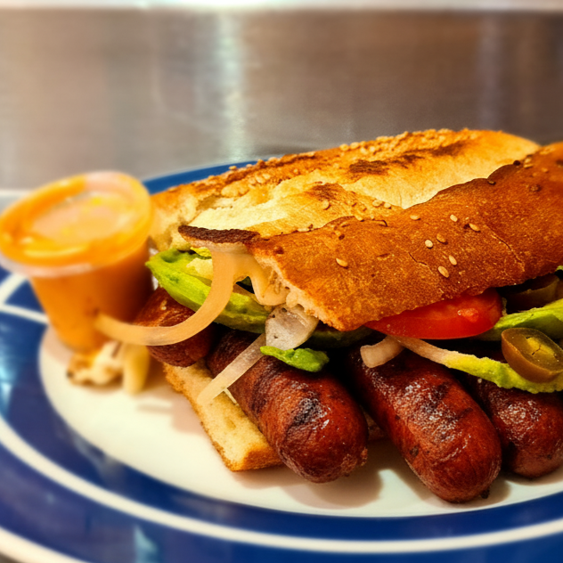 Deliciosa torta de salchicha calentada a la plancha con queso fundido, jitomate, aguacate, cebolla, chiles en vinagre y su porción de chimichurri.