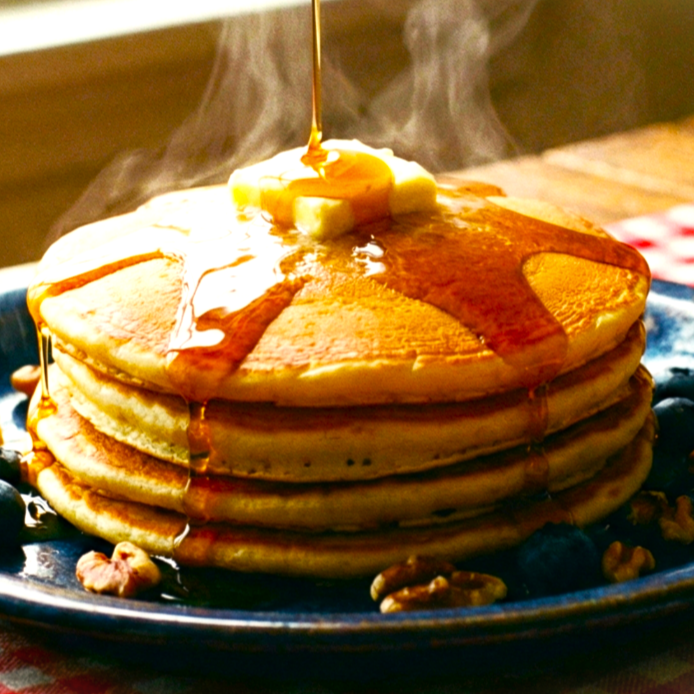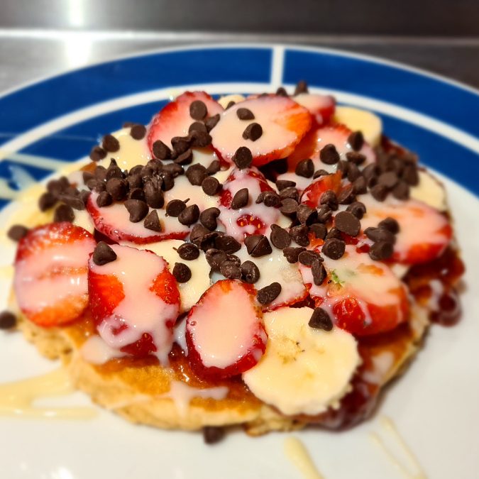 Hot Cake calientito con Fruta, Cereal y Jarabe