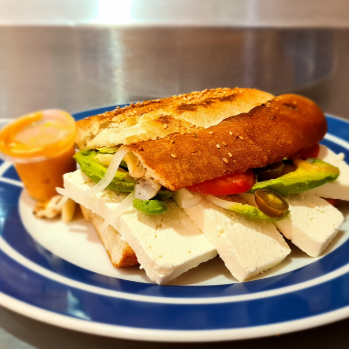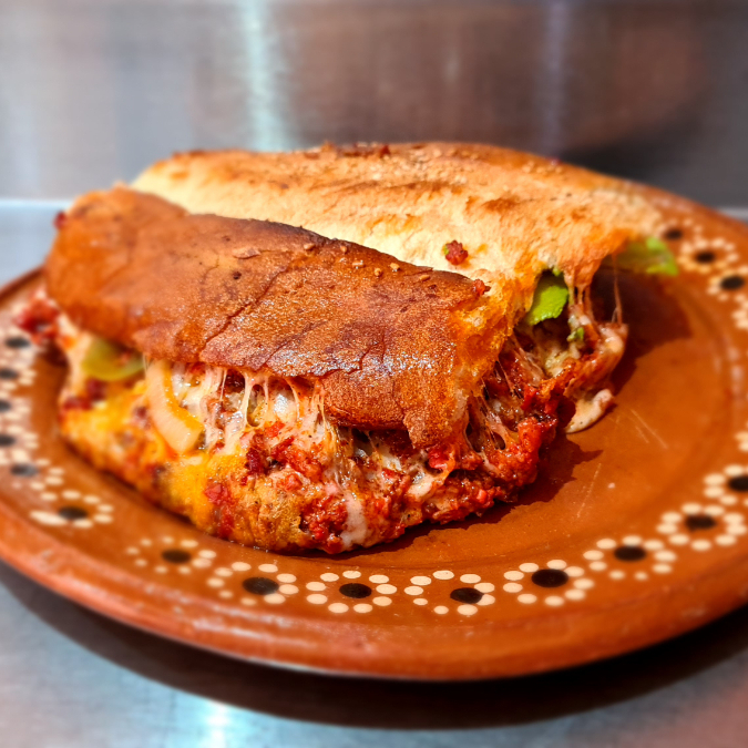 Deliciosa torta de queso de puerco, calentada a la plancha con queso fundido, jitomate, aguacate, cebolla, chiles en vinagre y su porción de chimichurri.