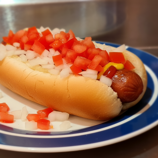 Delicioso hot dogs preparado con salchicha de cerdo con jitomate, cebolla, chiles en vinagre y cátsup.