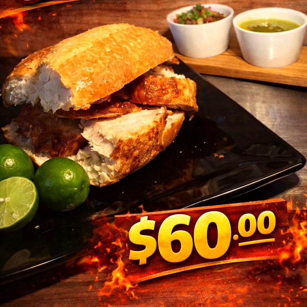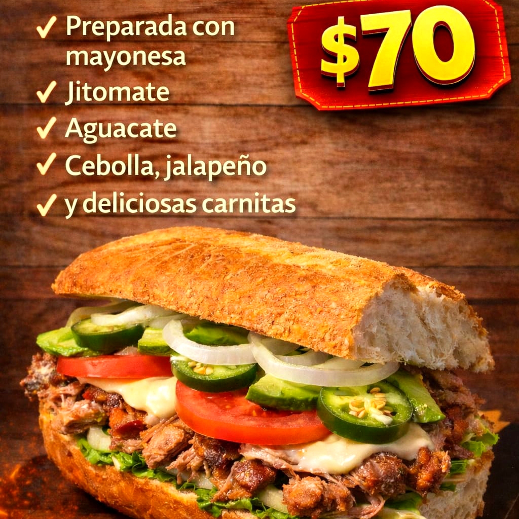 Preparada con mayonesa, jitomate, aguacate, cebolla, jalapeño y deliciosas carnitas acompsñada de salsa roja, salsa verde, pico de gallo y guacamole.,