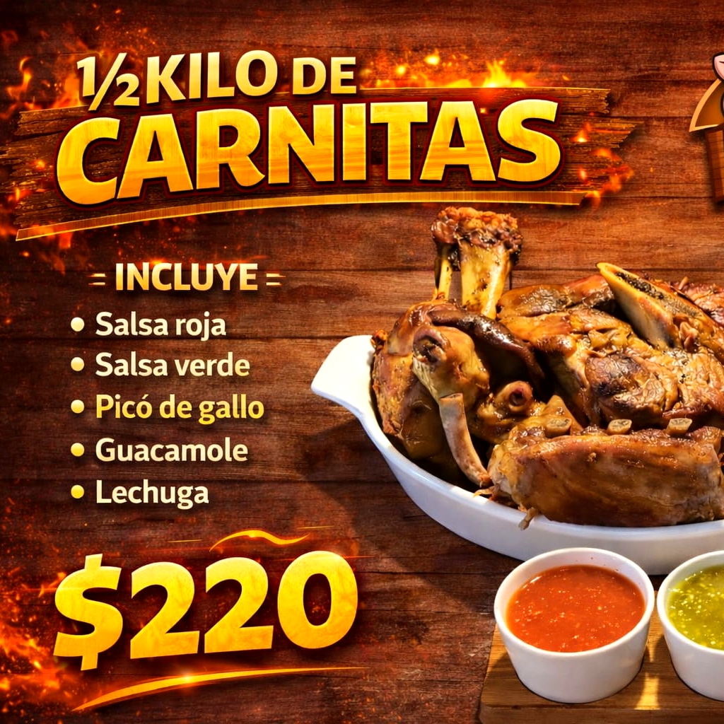 1/2 Kilo de carnitas acompañado de salsa roja, salsa verde, pico de gallo, nopales, guacamole, tortillas, totopos, limones, lechuga y refresco peñafiel de 2 litros,