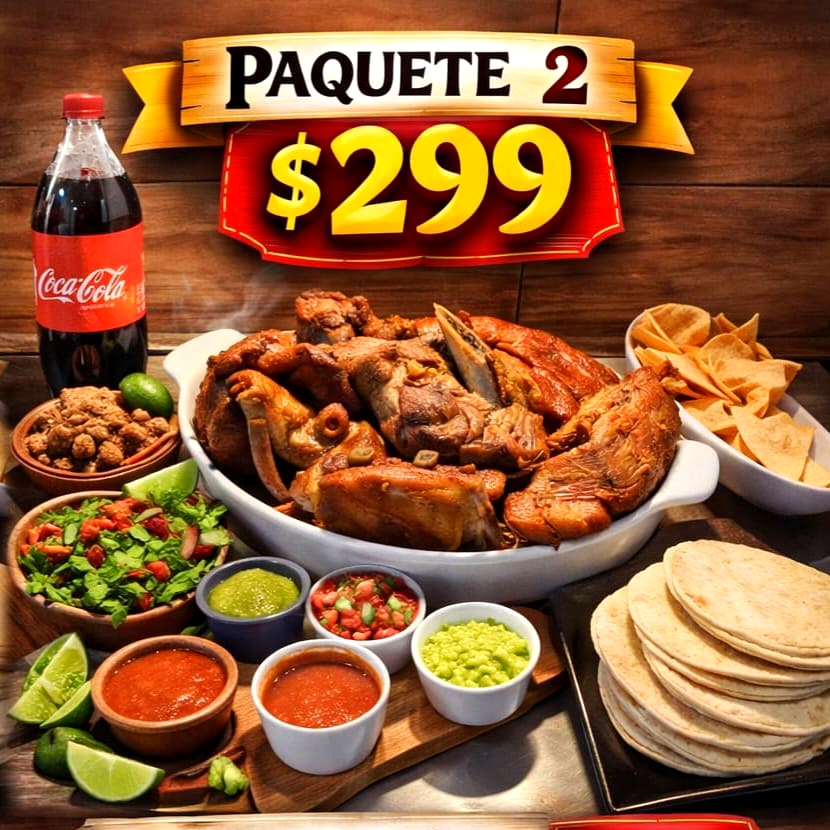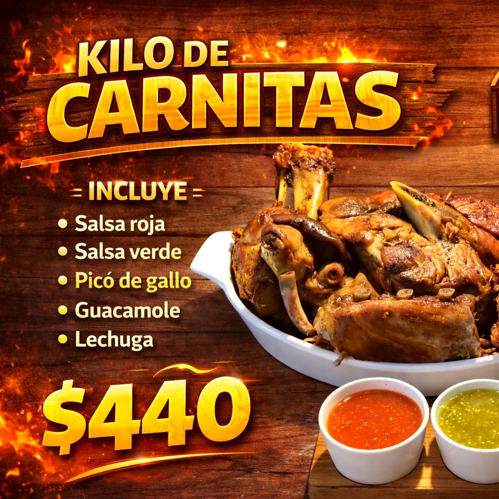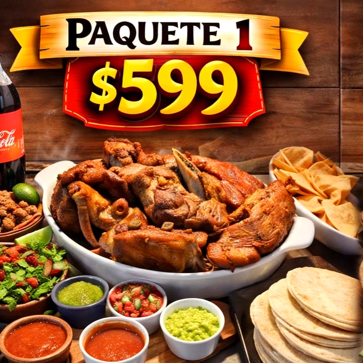 1 kilo de carnitas acompañado de salsa roja, salsa verde, pico de gallo, guacamole, nopales, tortillas, limones, lechuga y un peñafiel de 2 litros.