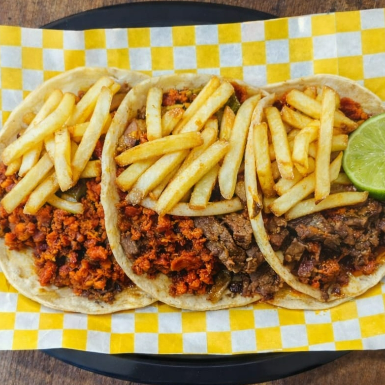 Taco con Dos Tortillas de Maiz de tamaño Normal que lleva una porcion grande de Chorizo de Res acompañado con Papas a la Francesa y Nopalito