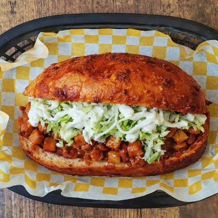 Pan de Pambazo Relleno con Papa, Chorizo de Res y Quesillo Fundido, Lechuga, Crema y Queso