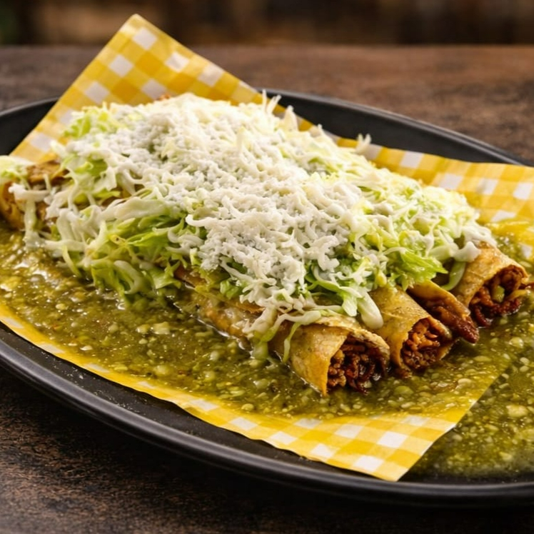 Orden de 3 Flautas rellenas de Carne bañadas en salsa verde cubiertas con lechuga, crema y queso