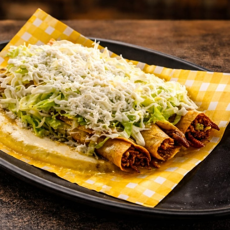 Orden de 3 Flautas rellenas de Carne, Pollo y Papa cubiertas con lechuga, crema y queso
