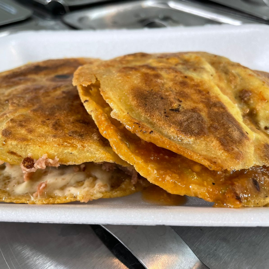 Gordita sencilla rellena de cualquiera de nuestros guisados: Prensado verde, Prensado rojo, Duro mocajeteado, chorizo molcajeteado, deshebrada, picadillo, papas guisadas, trocito rojo, y frijoles