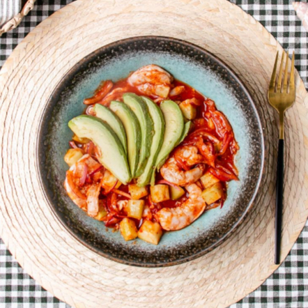 Porción generosa con camarones cocidos, servidos en salsa coctelera con jitomate, cebolla, cilantro, pepino, aguacate y jugo de limón. Perfecto para abrir apetito o como comida ligera.