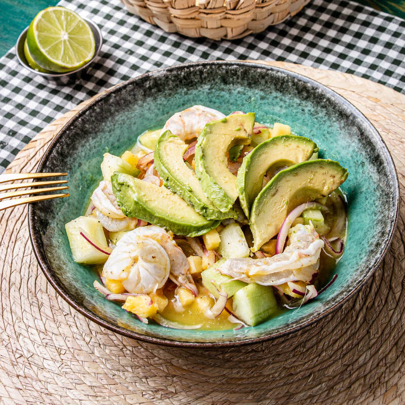 Ceviche fresco de camarón en trozos con verdura y cítricos.