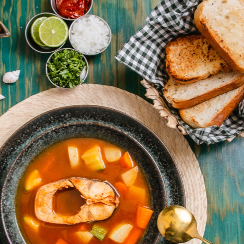 Caldito casero con filete de pescado fresco, cocinado al momento en un fondo de jitomate, ajo y especias. Servido con verduras, limón, chile y tortillas calientes. Reconfortante y con mucho sabor del mar.