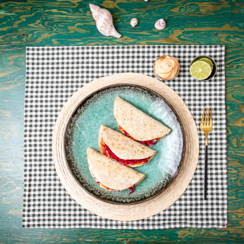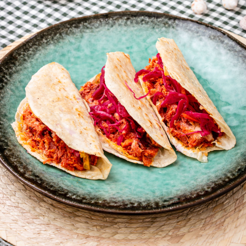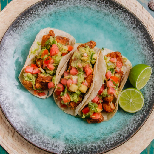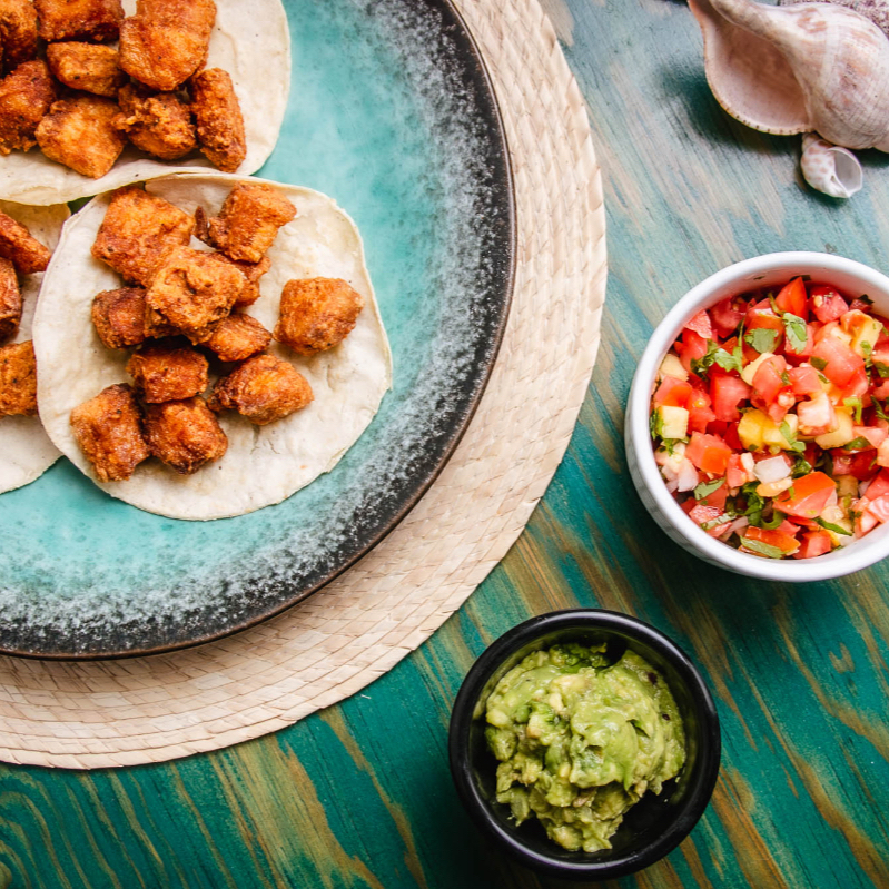 Tacos de Seitan de algas, también puede ser berenjena capeada, si así lo prefieres por favor háznoslo saber.