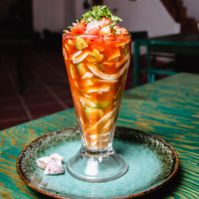 orción individual de camarones cocidos en salsa coctelera con jitomate, cebolla, cilantro y limón. Incluye pepino, aguacate y el toque de chile al gusto. Ligero y fresco.