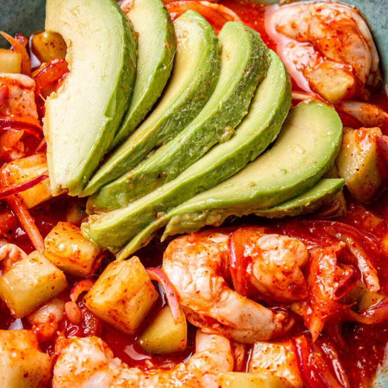 Salsa de mango y Chule chiltepin. Con camarón cocido al limón, cebolla morada y pepino.