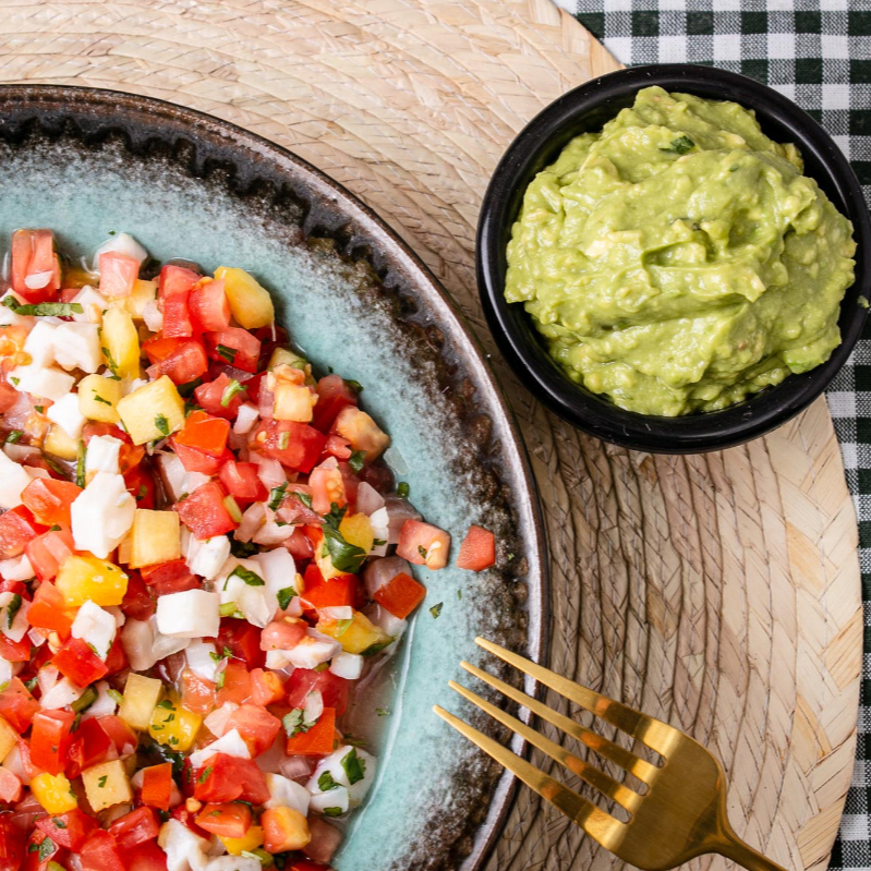 Pescado blanco troceado y capeado, acompañado con pico de gallo y guacamole.