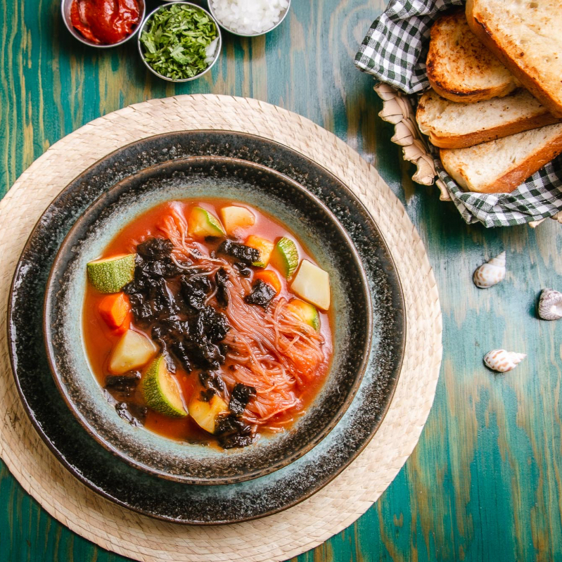 Caldo ligero con fondo de jitomate, ajo y especias, preparado con una mezcla de algas marinas y verduras cocidas. Tiene un sabor suave pero sabrosón, ideal si buscas algo nutritivo, diferente y lleno de mar.