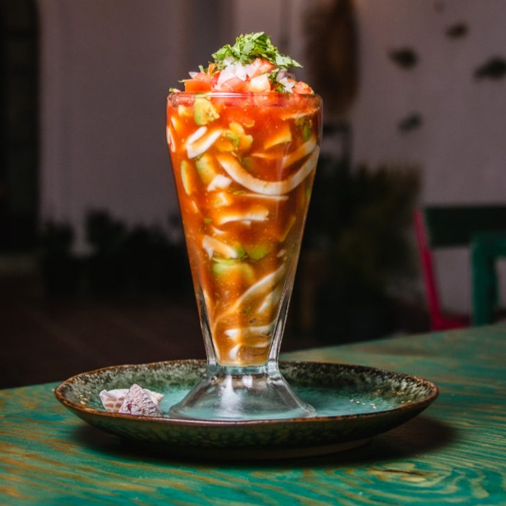 Cóctel bien servido, con camarones cocidos en su punto, en salsa coctelera clásica con jitomate, cebolla, pepino, limón y chile al gusto. Lleva aguacate y se acompaña con galletas. Ideal para compartir o saciar el antojo.