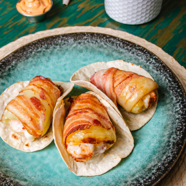Chile Güero con mezcla de quesos y camarón, envuelto en tocino.