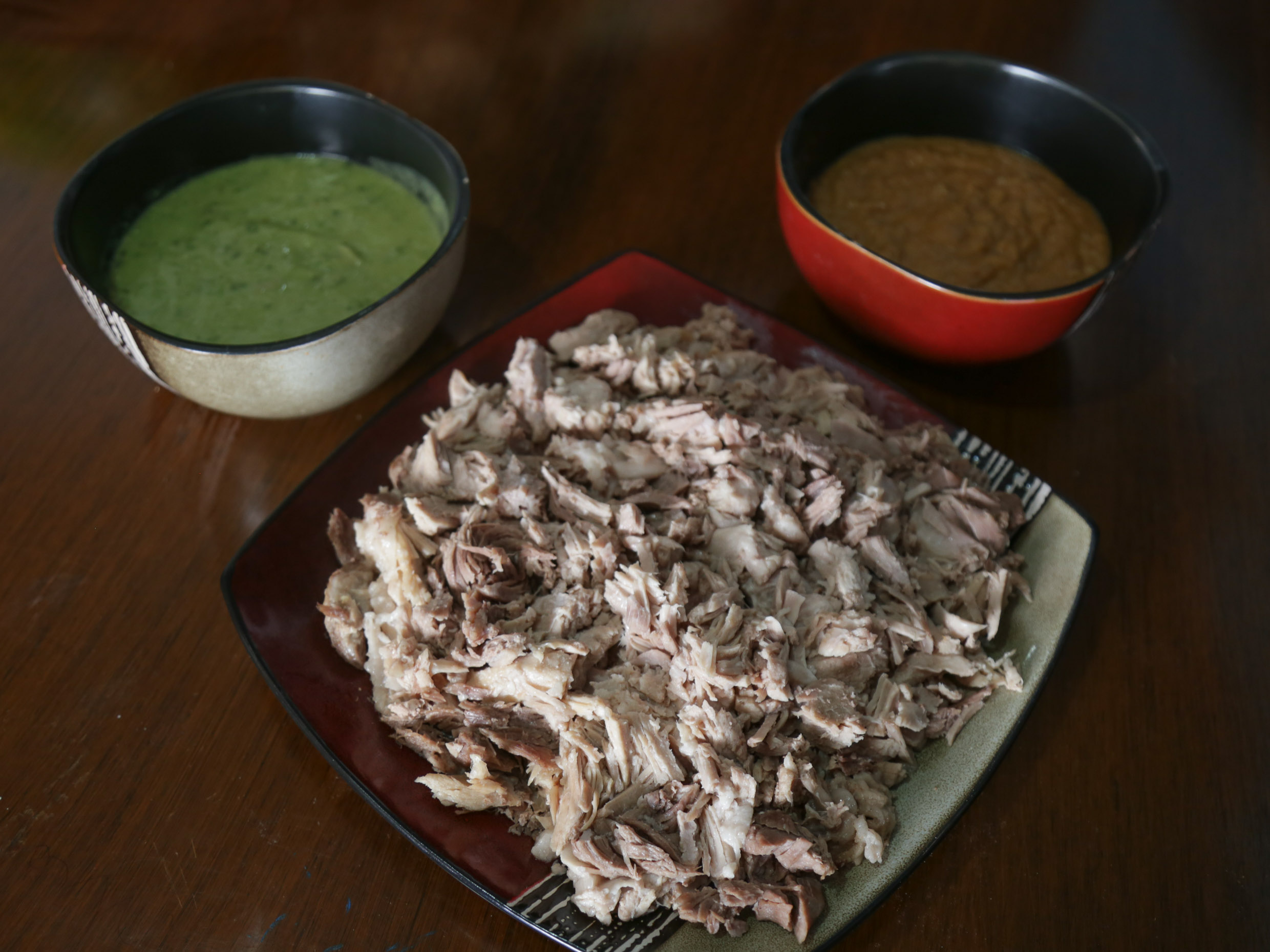 1 Kg de lechón maciza o surtido, cuero dorado y blando. 1/2 frijoles refritos 1/2 Kg de guacamole 1/4 de salsa picante