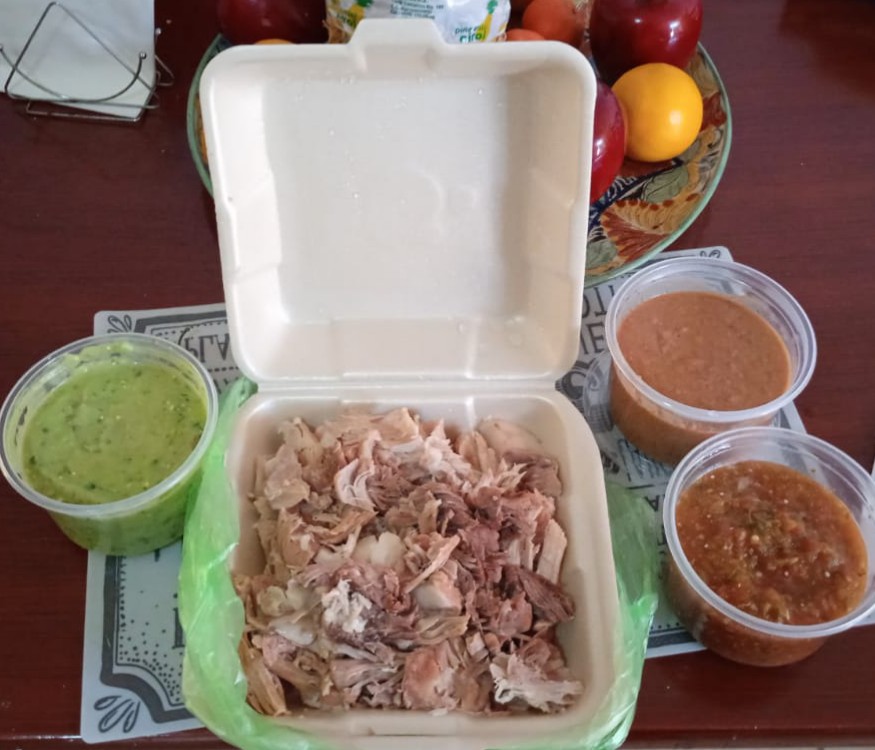 1/2 KG Lechón, 1/2 kg de frijolitos refritos adobados, 1/2 lt. De guacamole, 1/4 lt. De salsa amartajada picante y verdura