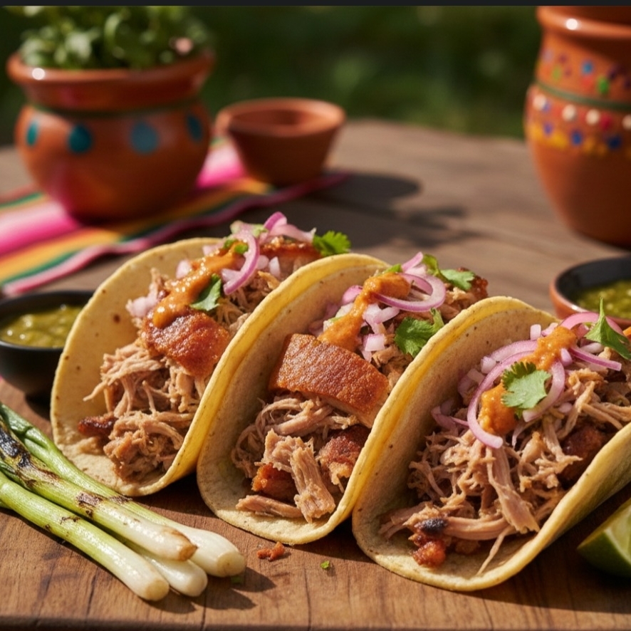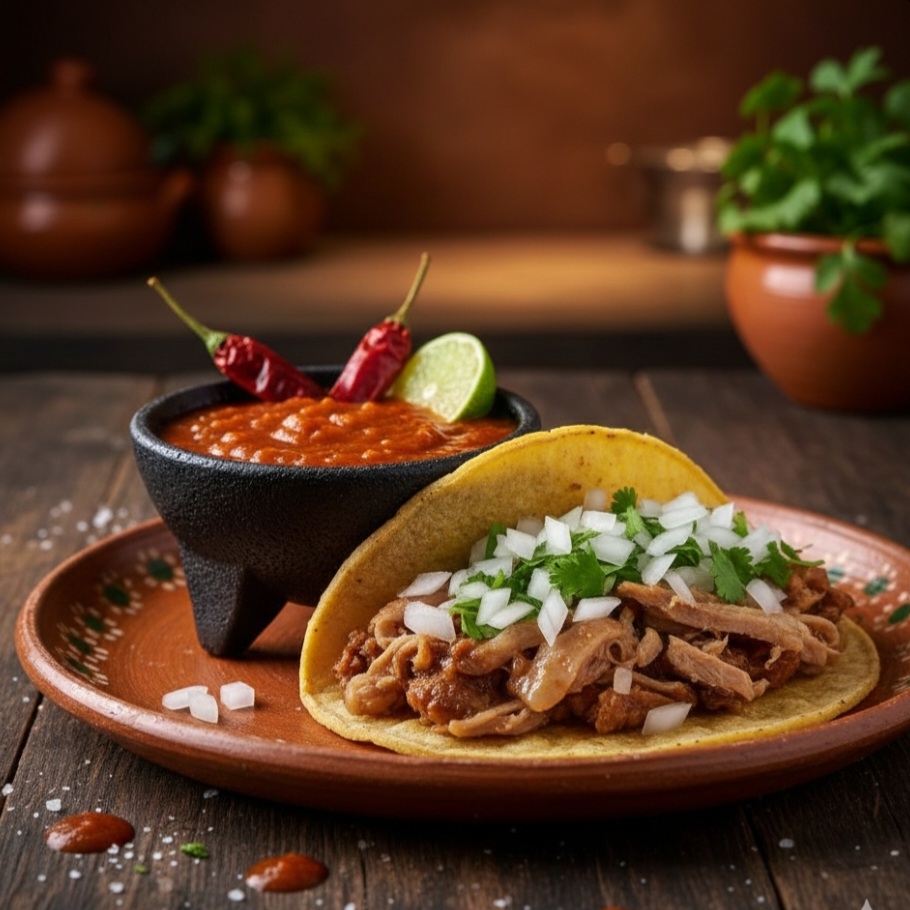 Delicioso taco de lechón tierno y jugoso, servido en tortilla de maíz caliente con el sazón tradicional de la casa.