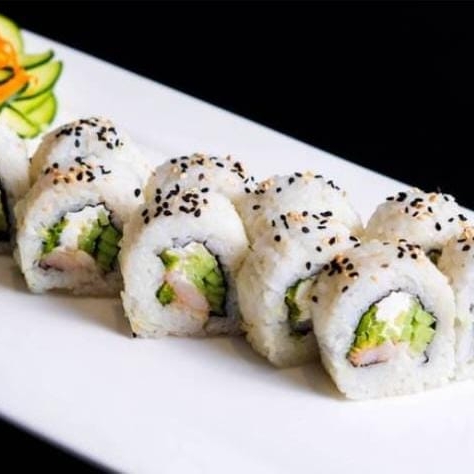 Camarón, aguacate y pepino bañado con queso crema y ajonjoli