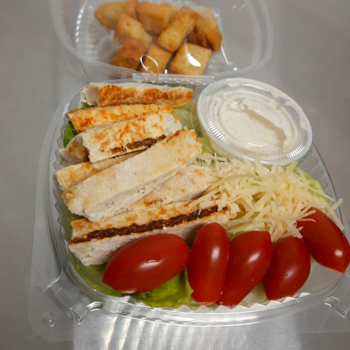 Pollo, lechuga, queso parmesano, jitomate cherry, crutones, aderezo.