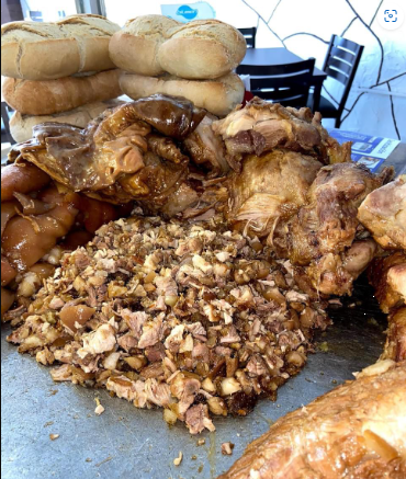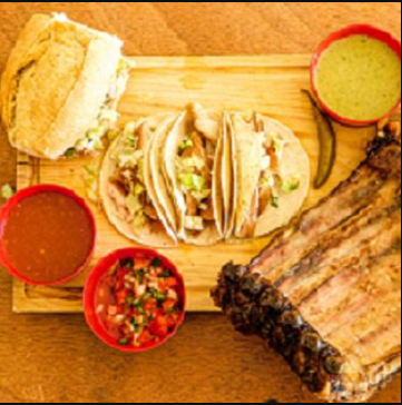 2 Tortas de carnitas surtido y 5 Tacos de carnitas surtido, acompañado de lechuga, salsa, limones, chiles y pico de gallo