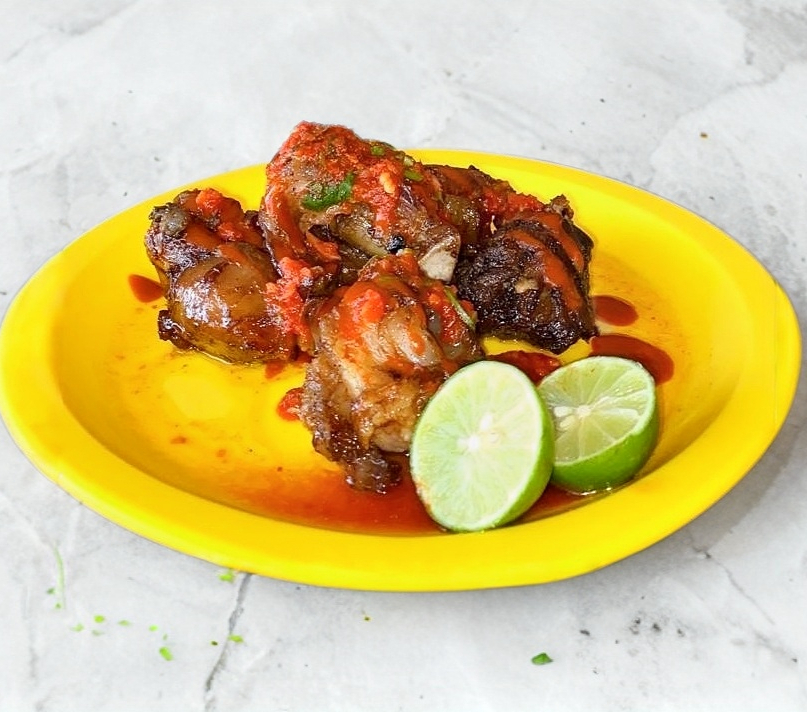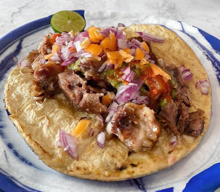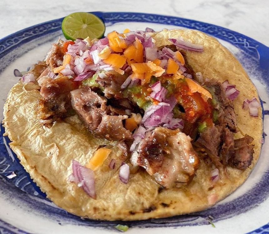 Deliciosas carnitas con doble tortilla, acompañado de exquisito pico de gallo, salsa roja picante y guacamole.