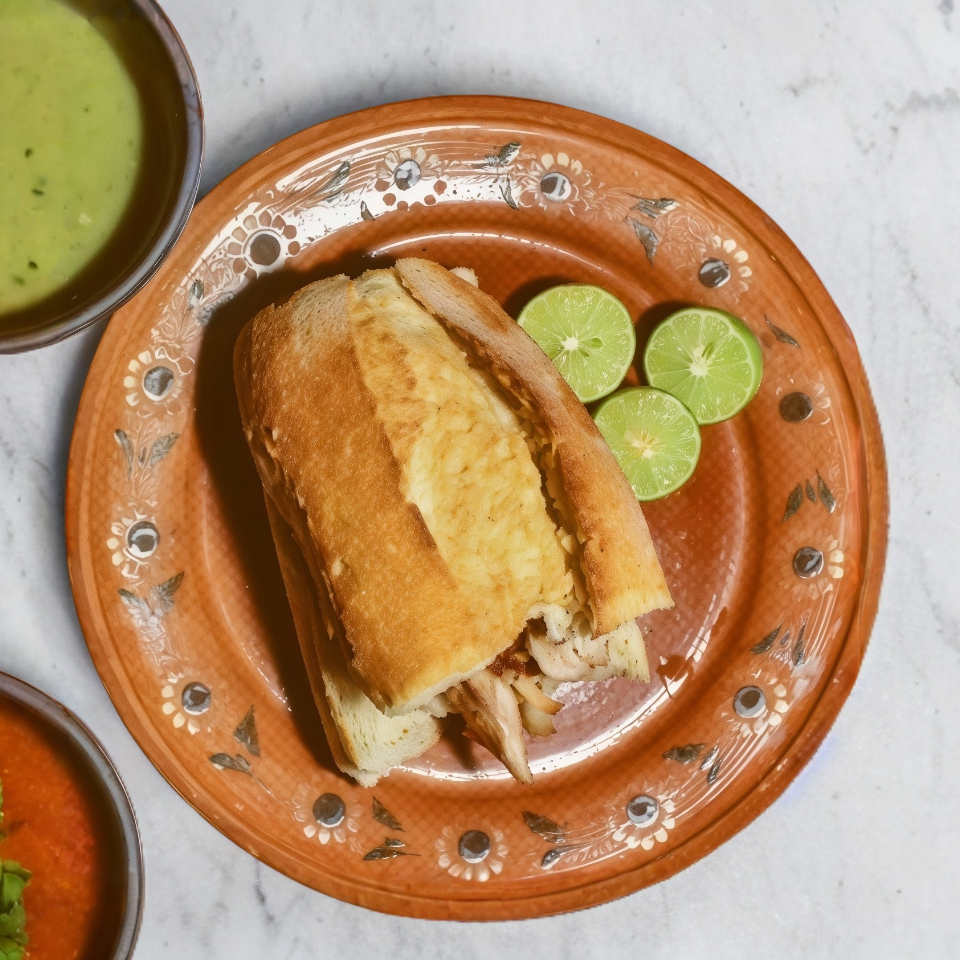 Deliciosas carnitas en bolillo, acompañado de exquisito pico de gallo, salsa roja picante y guacamole.
