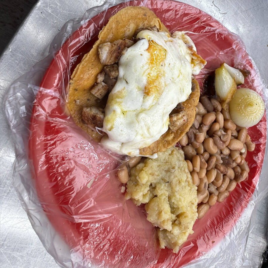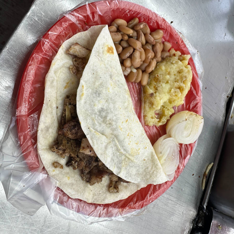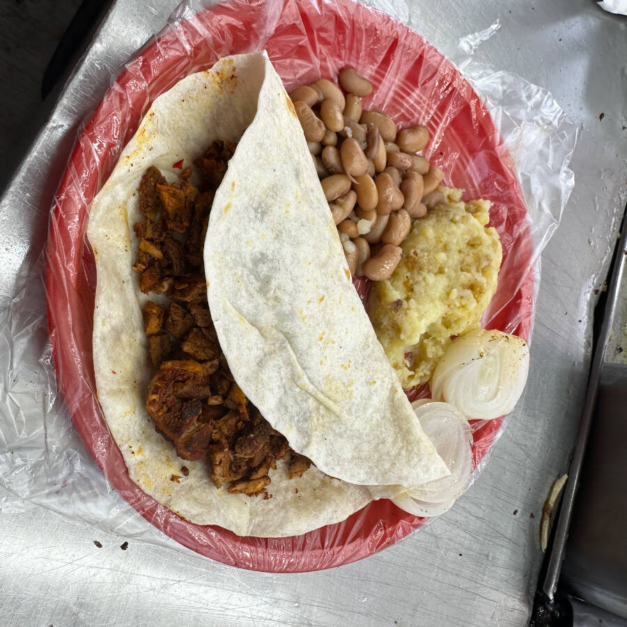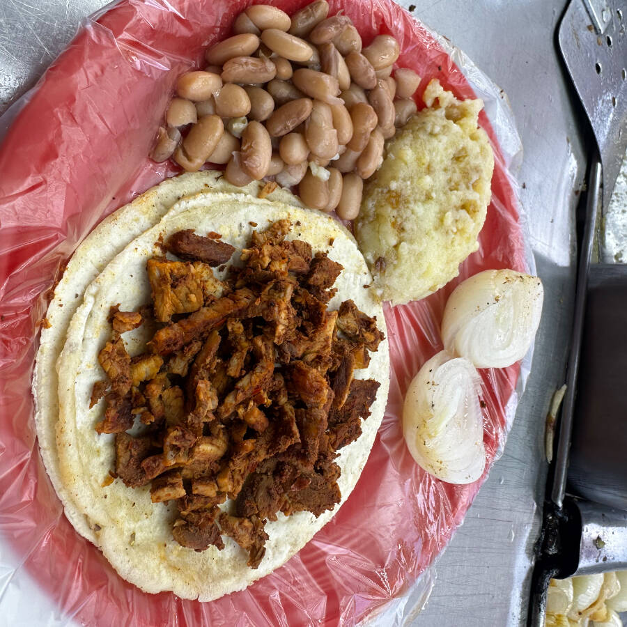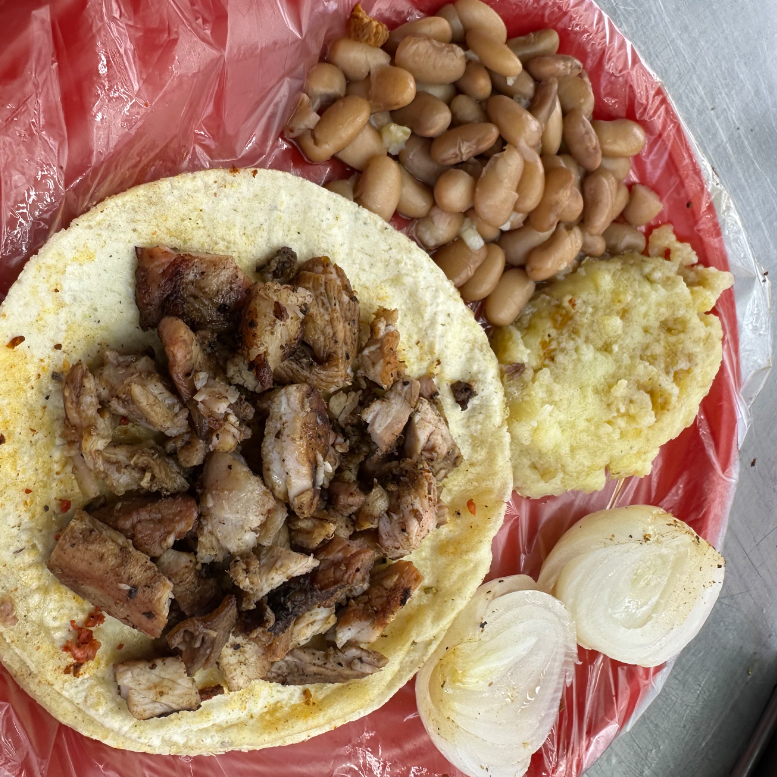 Base doradita con queso y adobada marinada, más frijoles y papa.