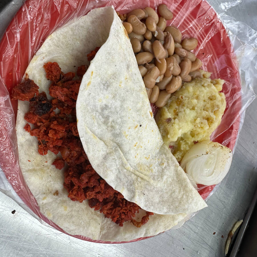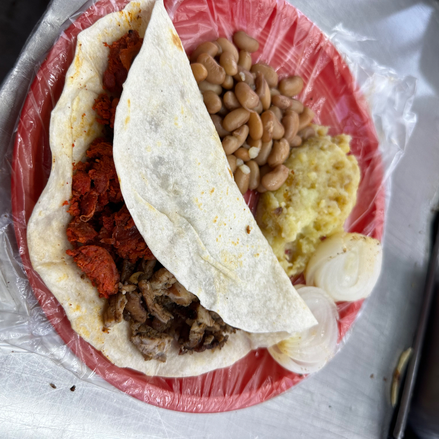 La mezcla perfecta de asada y chorizo o adobada con frijoles y papa.