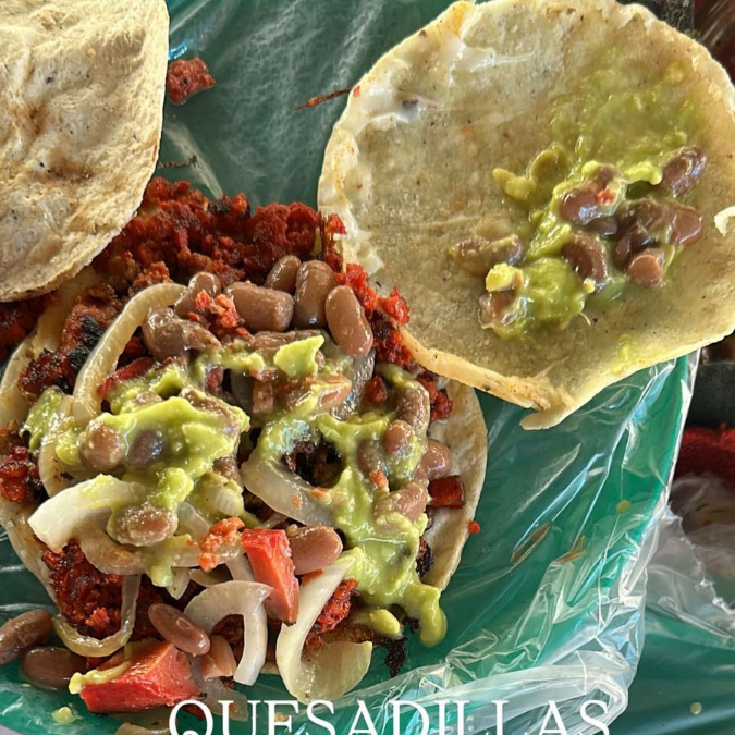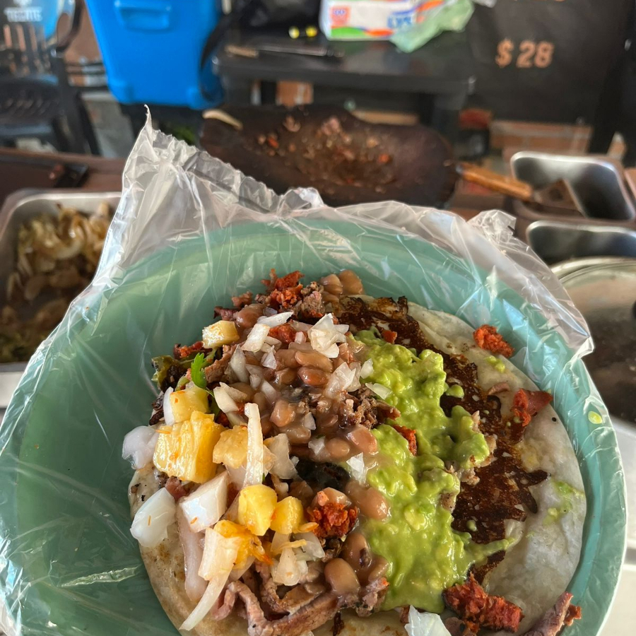 Tortilla de maíz acompañado de chistorra y frijoles de olla.