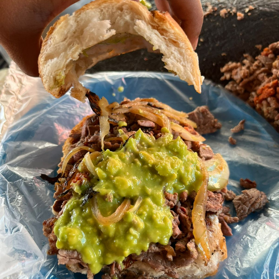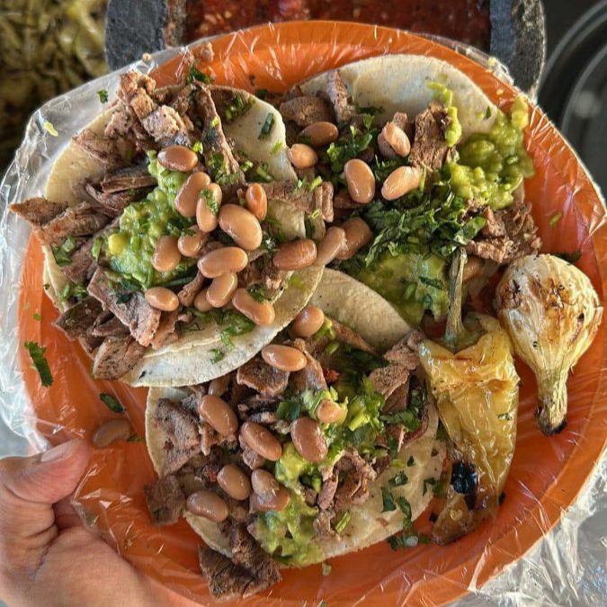 Tortilla de maíz acompañado de carne asada y frijoles de olla.