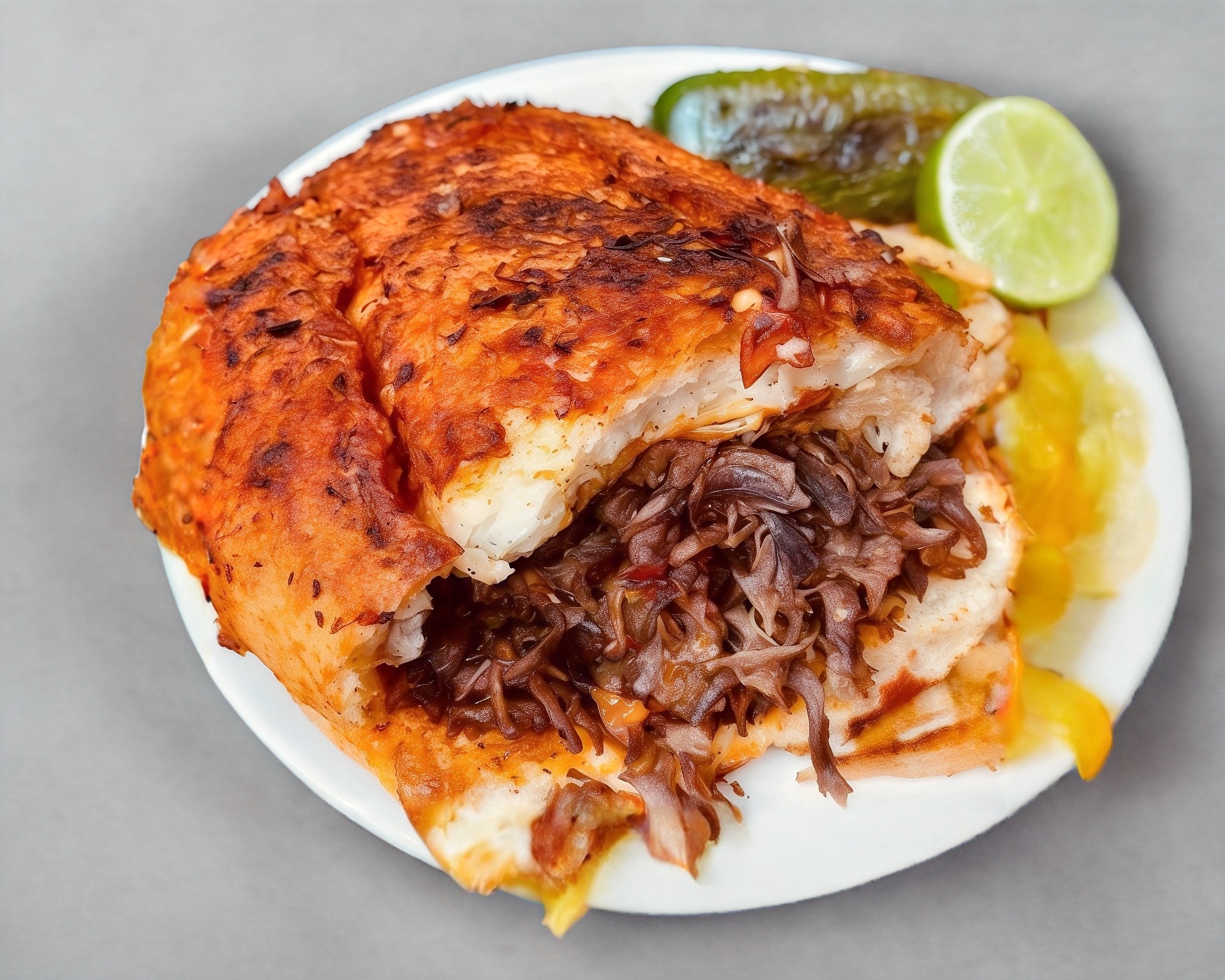 Bolillo estilo Aguascalientes relleno de queso y barbacoa de res exquisitamente sazonada con nuestro famosísimo estilo Jalisco. Incluye consomé, verduras y salsas.