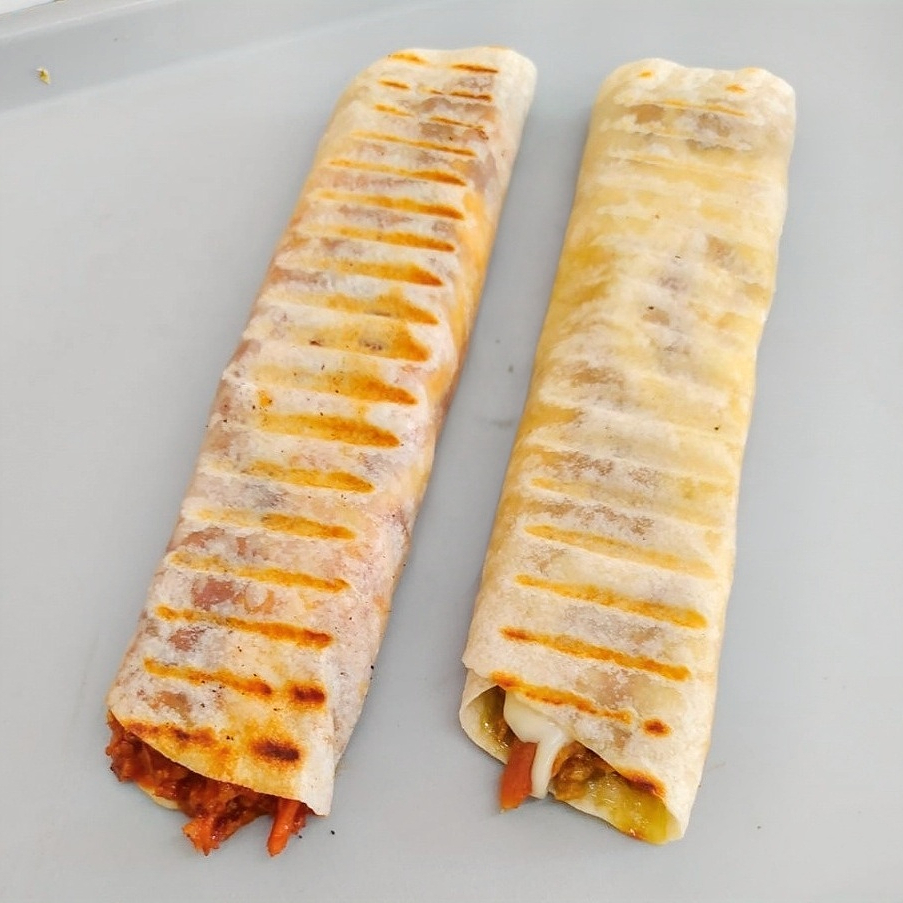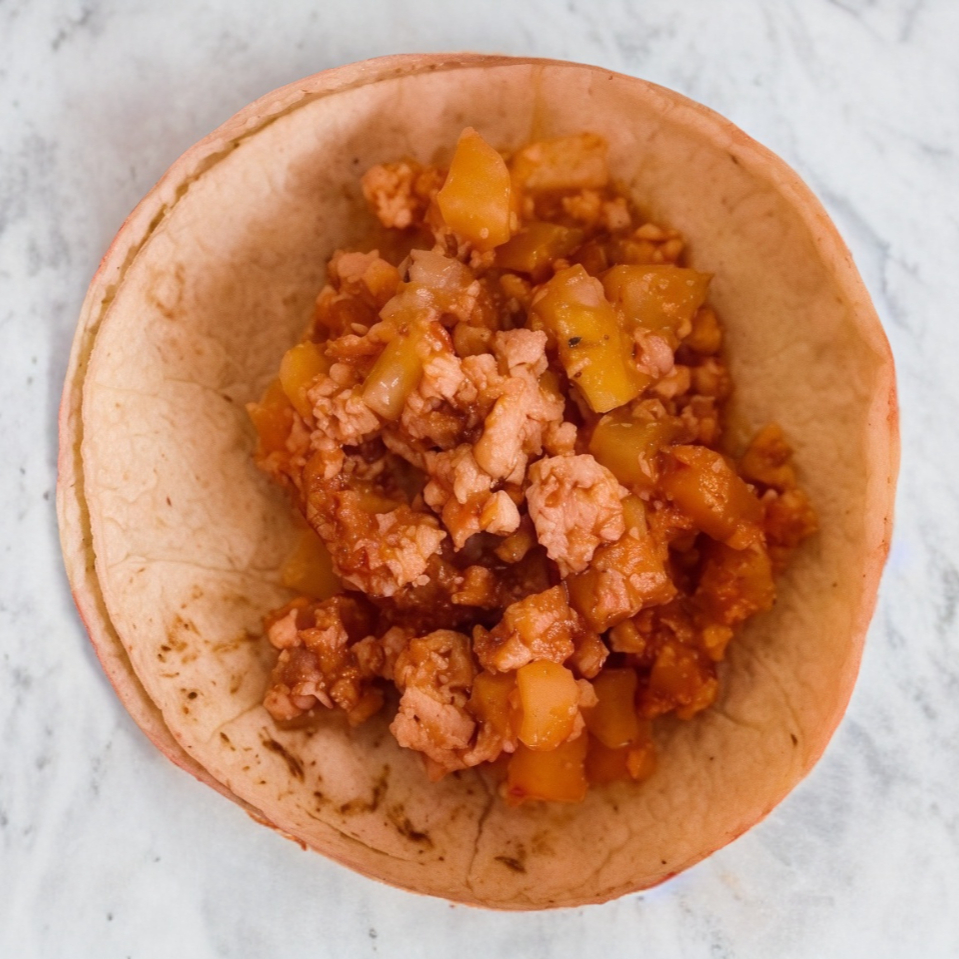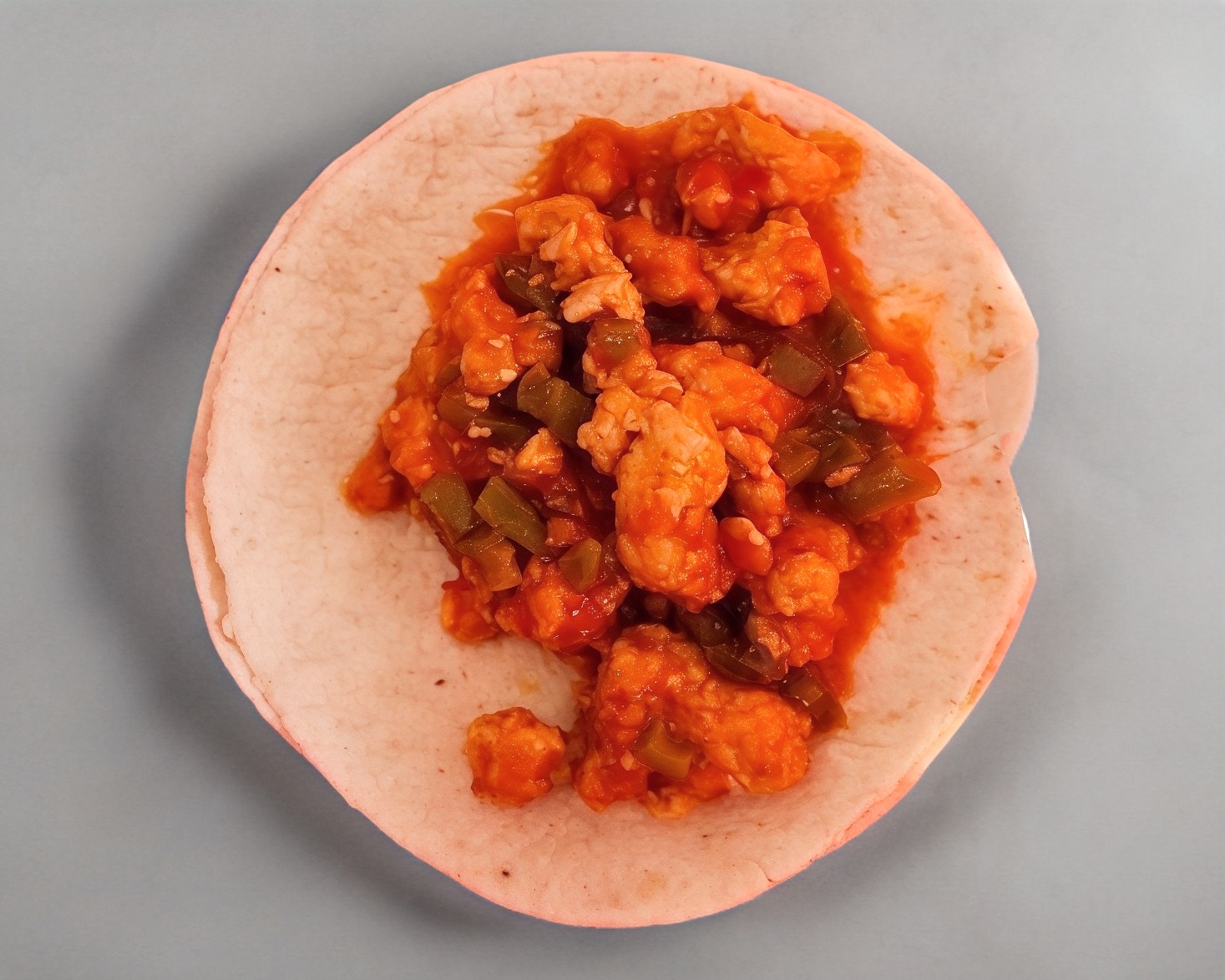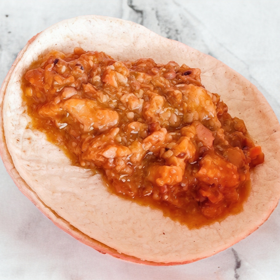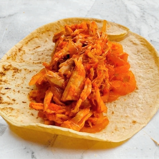 Taco con guiso de puerco desmenuzado, cocido en una salsa de tomate, cebolla, ajo y chiles chipotles.
