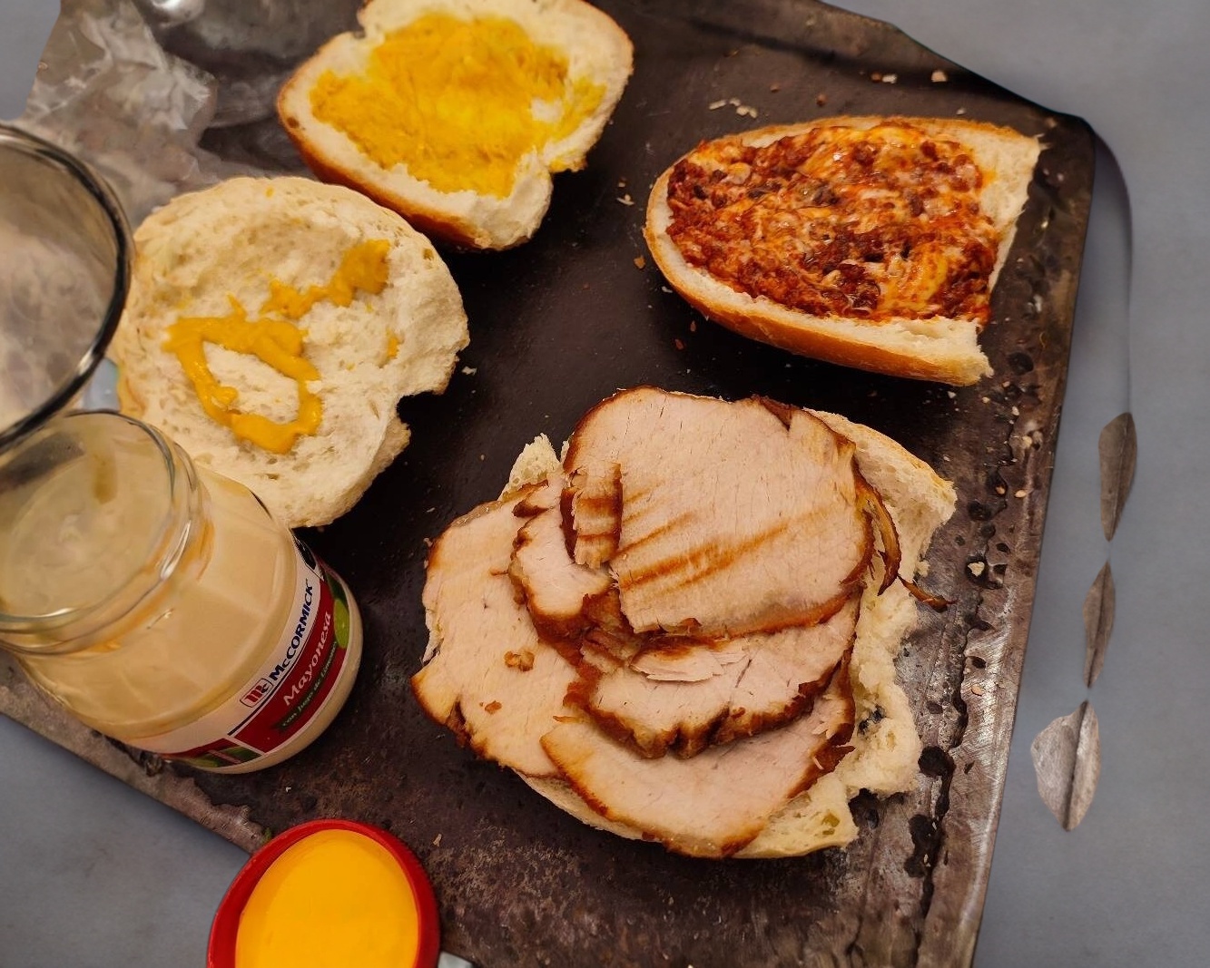 Lomo de puerco, mostaza, mayonesa, queso, jitomate, cebolla, lechuga, chile jalapeño, aguacate.