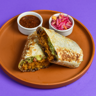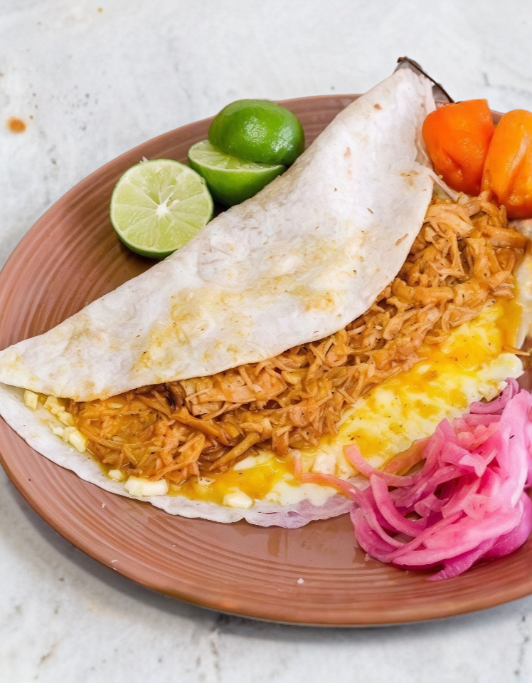 Cochinita pibil con queso en tortilla de harina. Un sabor que te encantará.