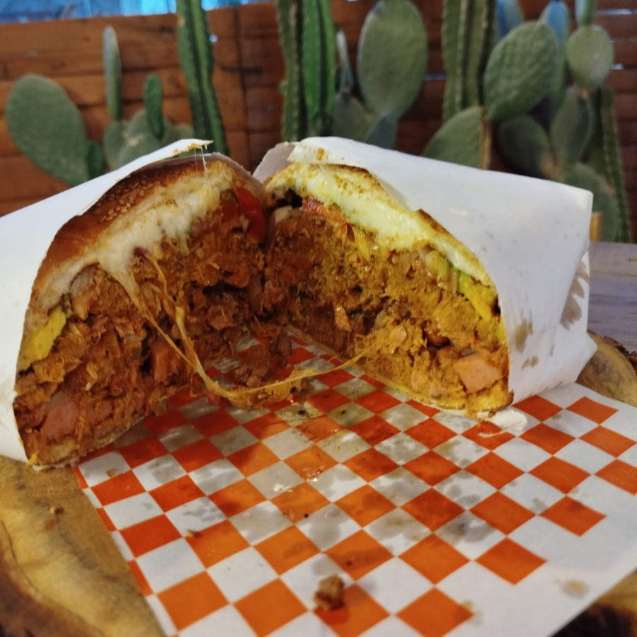 Con jugosa carne de arrachera, queso, tocino y aderezos de la casa.