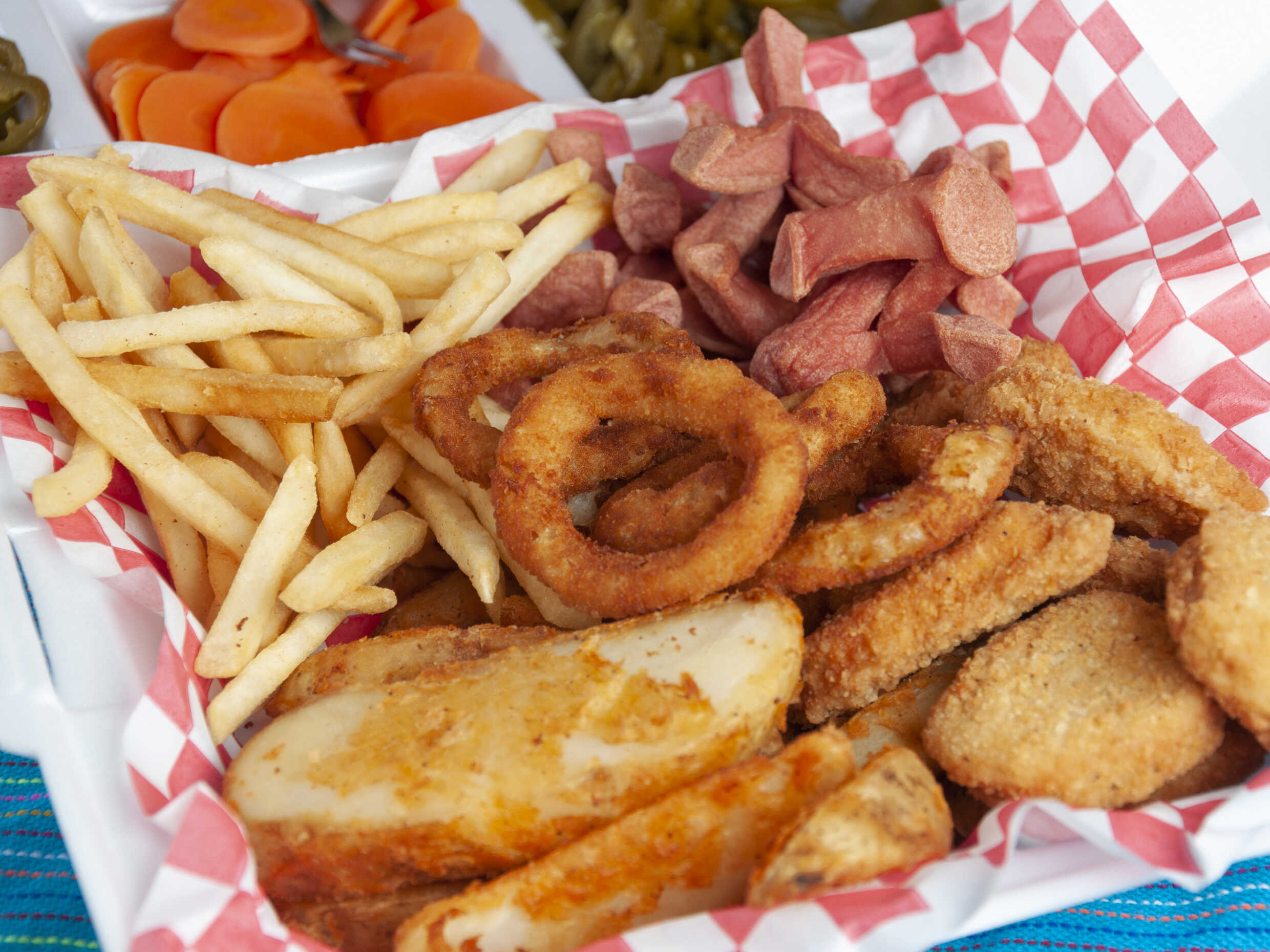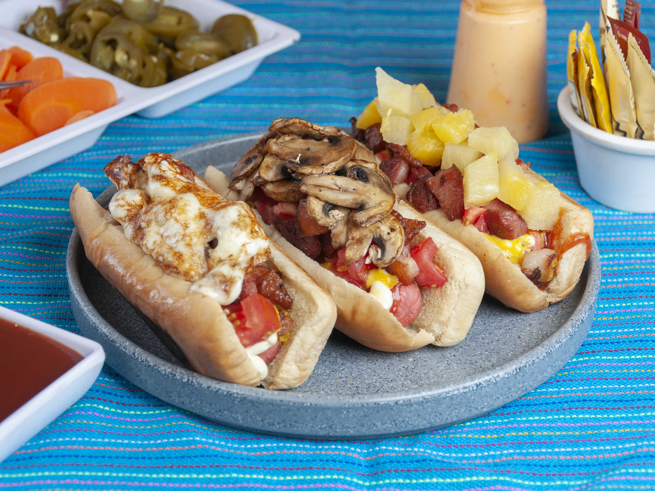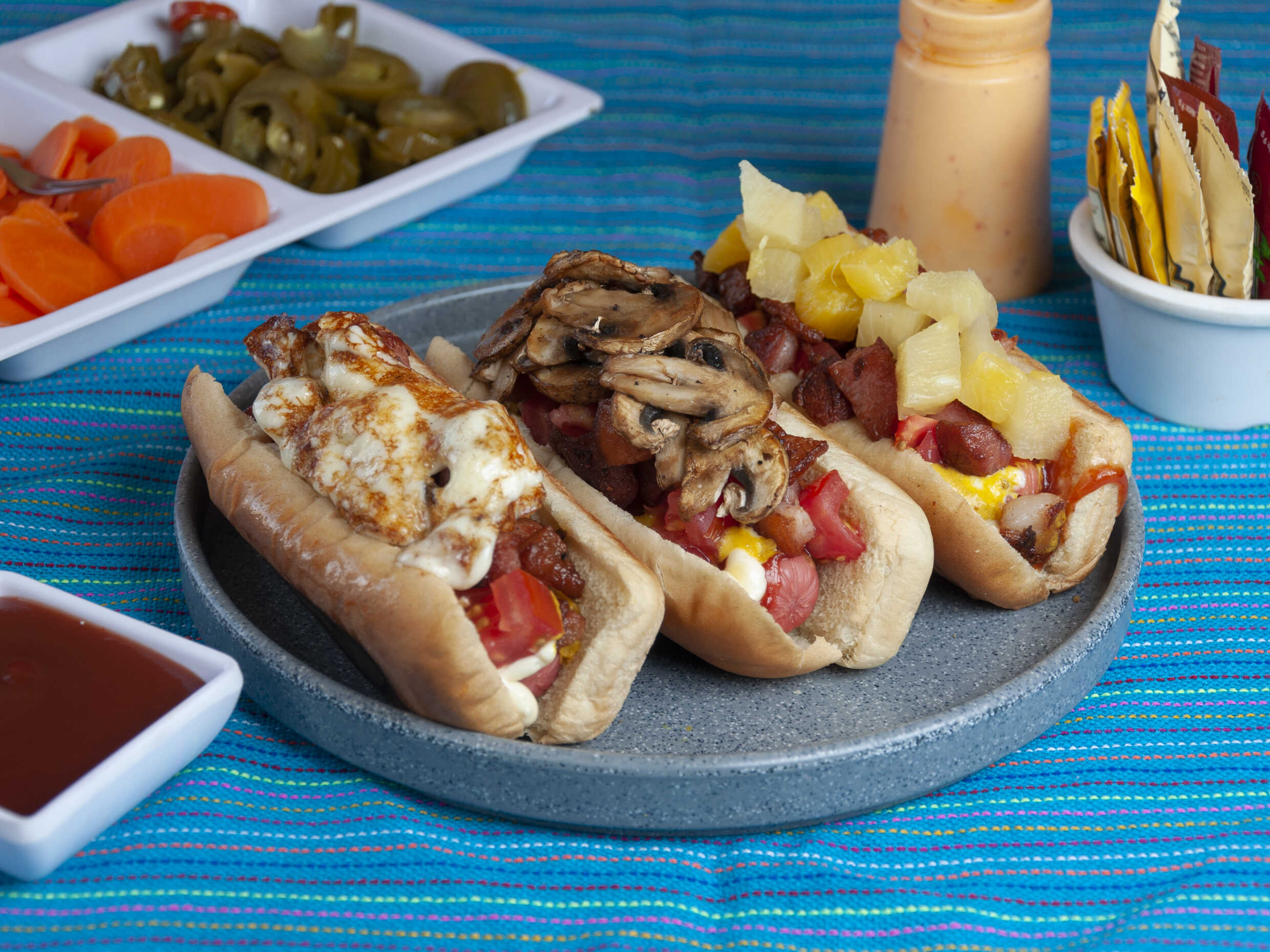 Salchicha, tocino, piña o champiñón o queso asadero o torito (serrano, cebolla y limón), jitomate, catsup, mayonesa y mostaza.